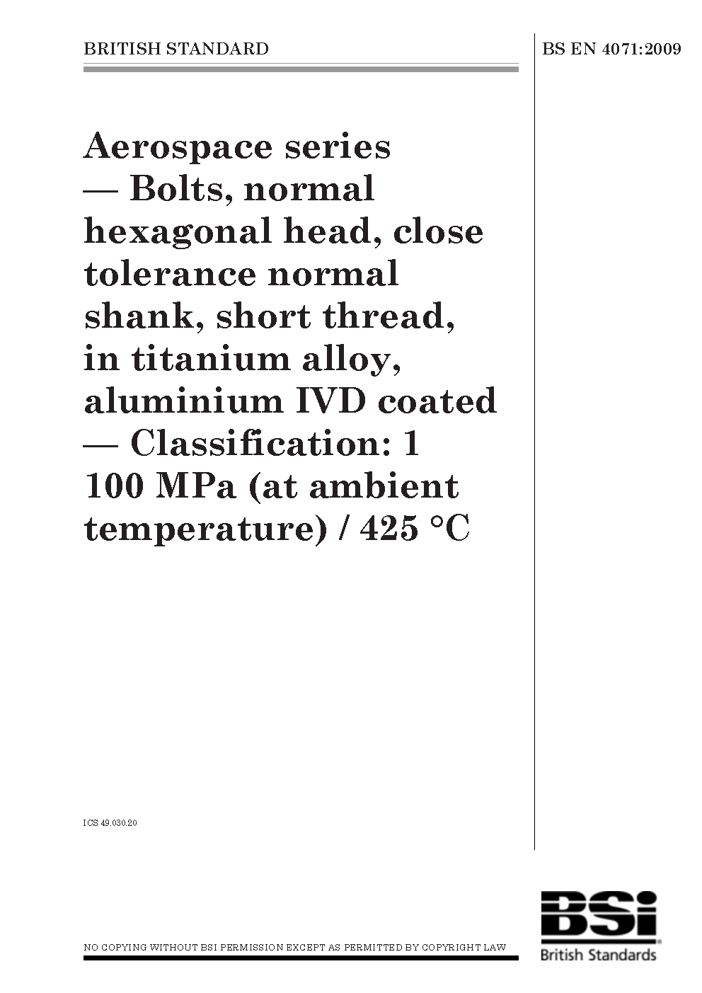 BS EN 4071. Aerospace series. Bolts, normal hexagonal head, close tolerance normal shank, short thread, in titanium alloy, aluminium IVD coated. Classification: 1 100 MPa (at ambient temperature) / 425 °C