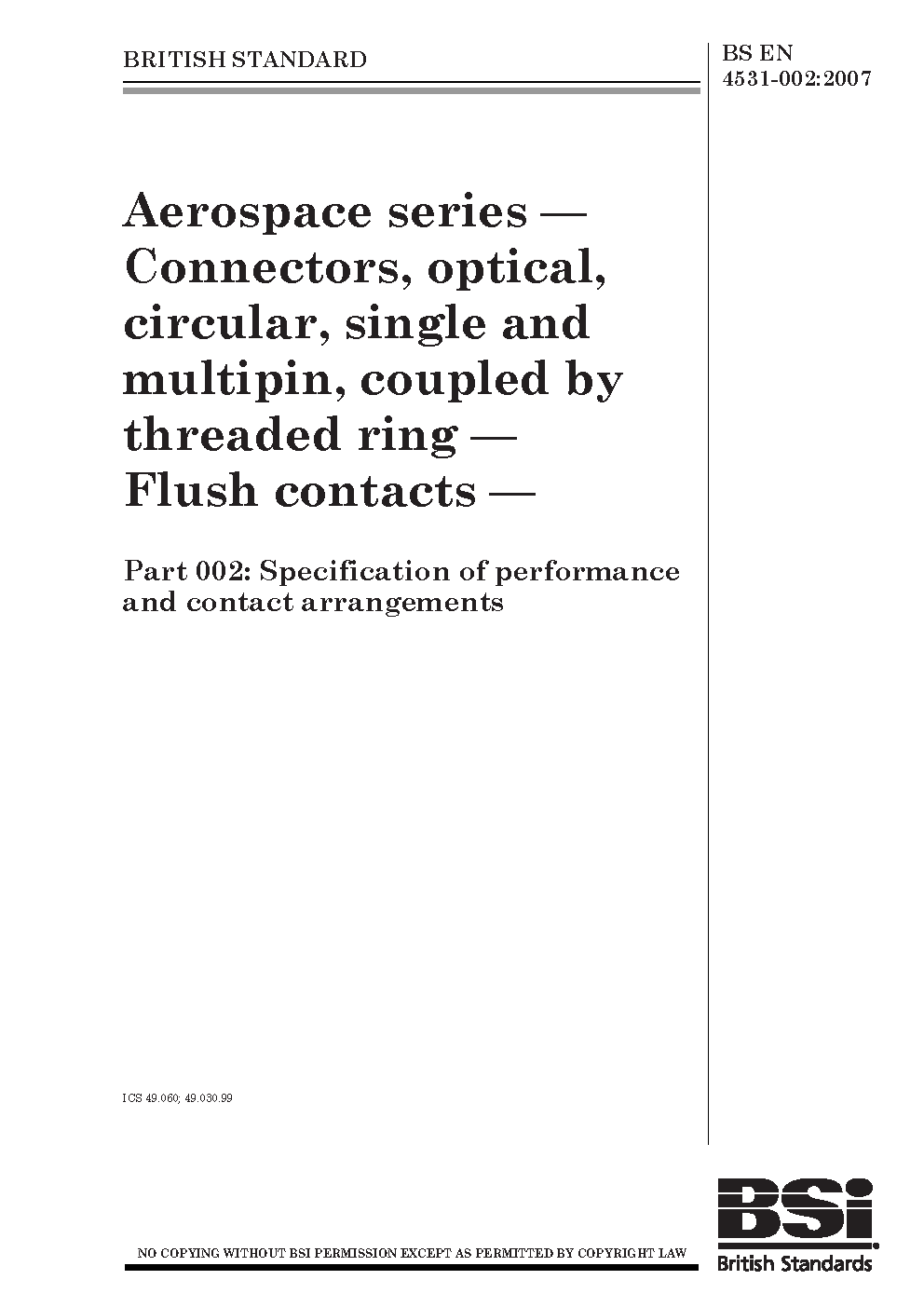 BS EN 4531-002. Aerospace series. Connectors, optical, circular, single and multipin, coupled by triple start threaded ring. Flush contacts. Part 002. Specification of performance and contact arrangements