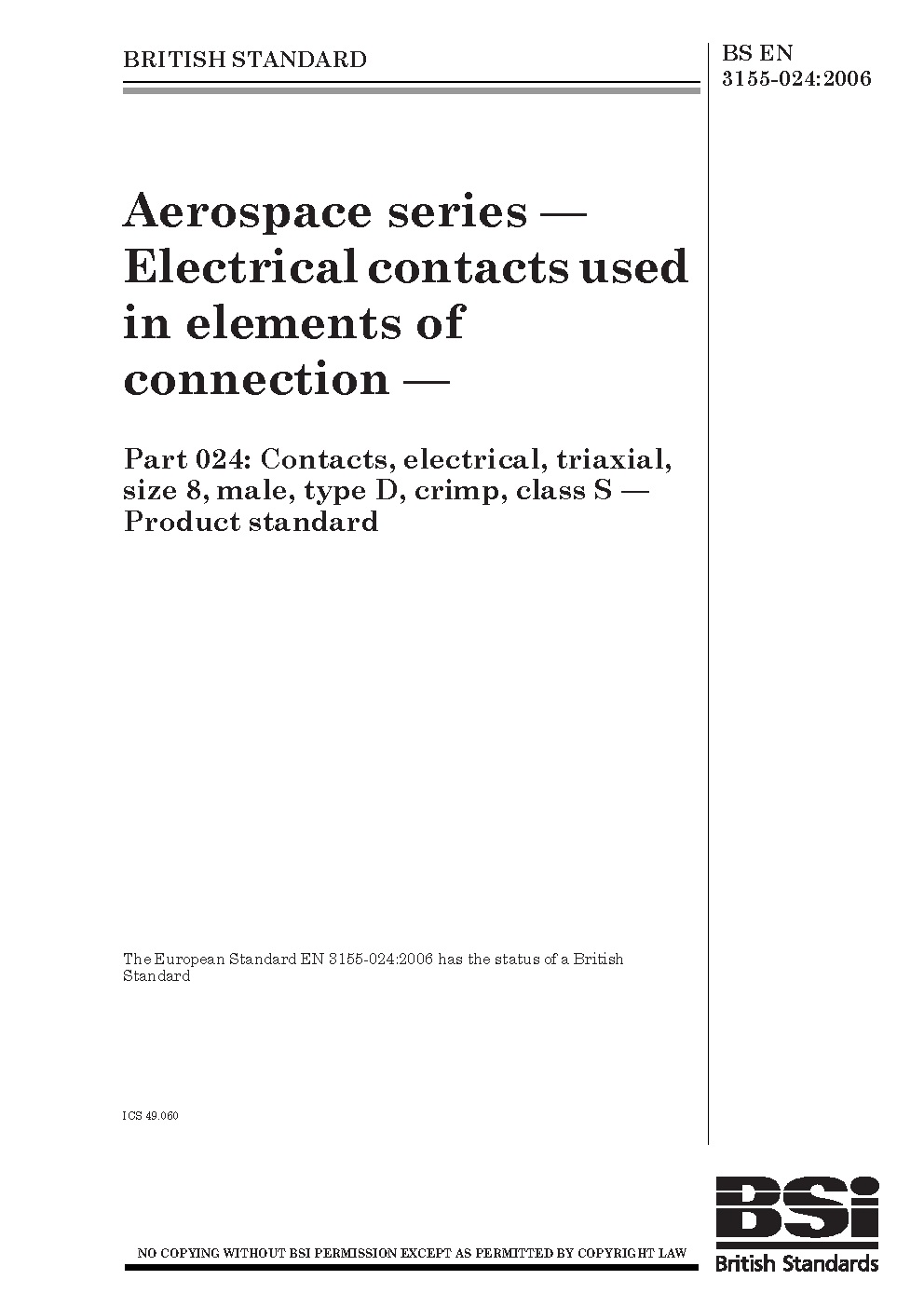 BS EN 3155-024. Aerospace series. Electrical contacts used in elements of connection. Part 024. Contacts, electrical, triaxial, size 8, male, type D, crimp, class S. Product standard