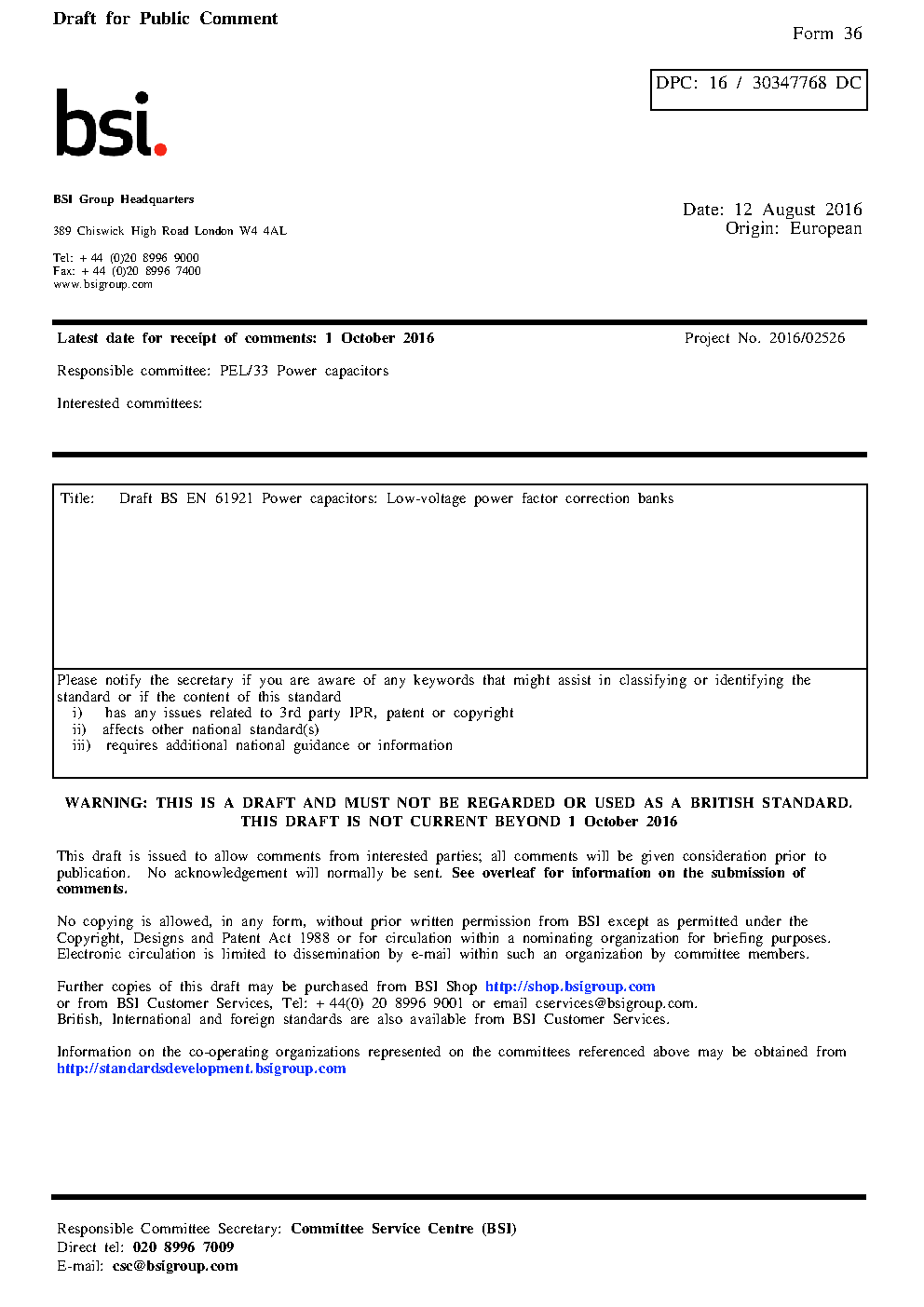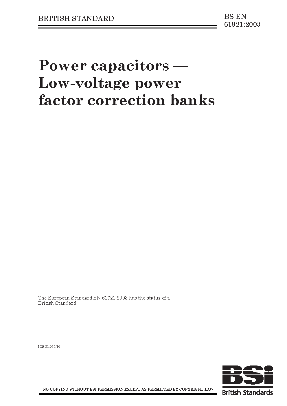 BS EN 61921. Power capacitors. Low-voltage power factor correction banks