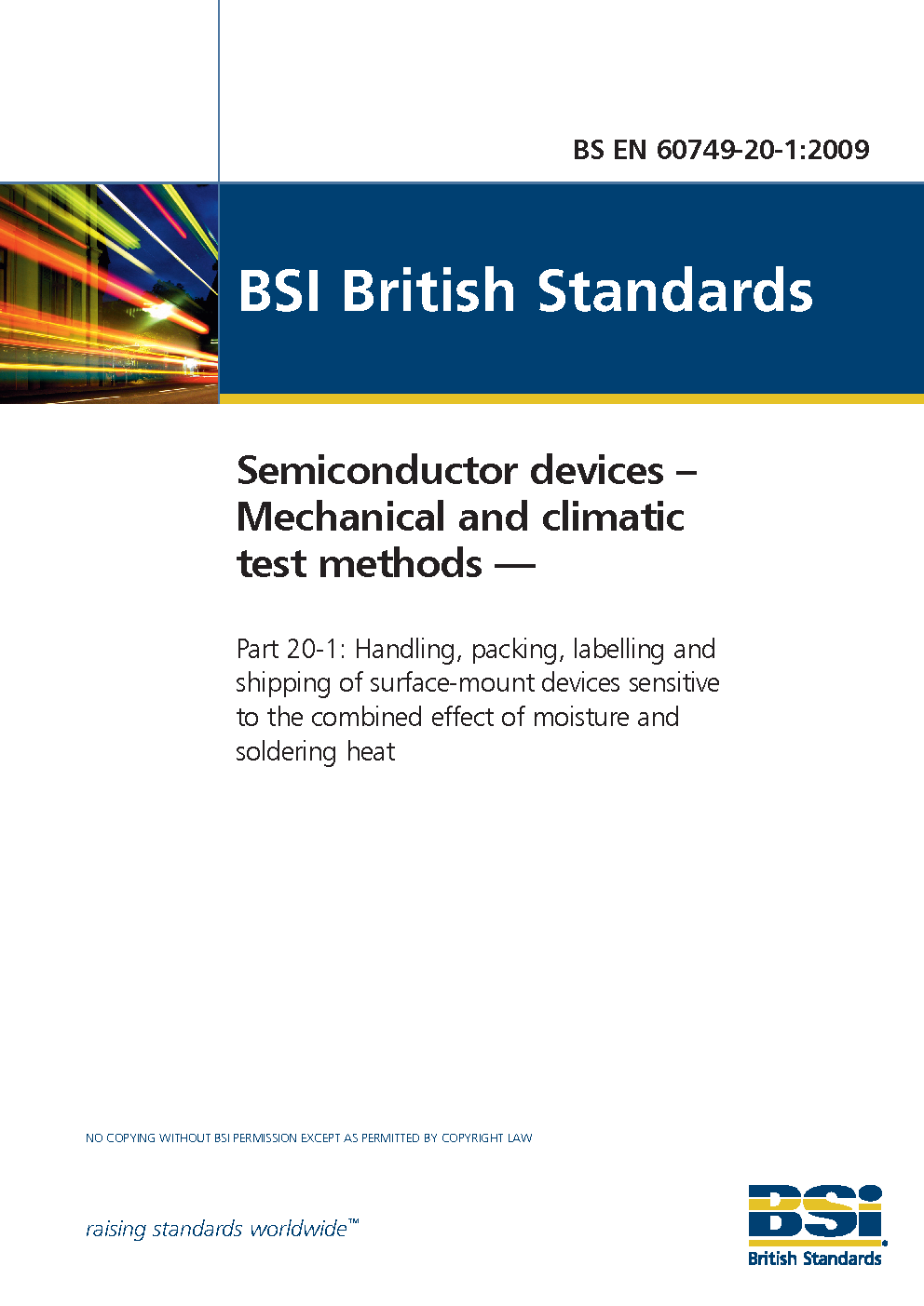 BS EN 60749-20-1. Semiconductor devices. Mechanical and climatic test methods Part 20-1. Handling, packing, labelling shipping of surface-mount devices sensitive to the combined effect moisture soldering heat