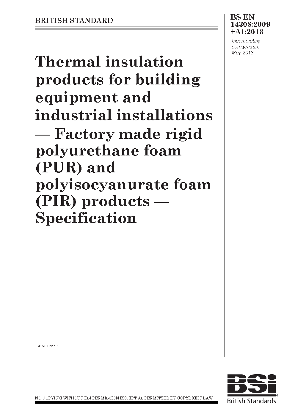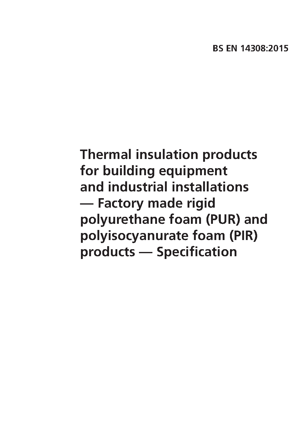 BS EN 14308 AMD1. Thermal insulation products for building equipment and industrial installations. Factory made rigid polyurethane foam (PUR) and polyisocyanurate foam (PIR) products. Specification