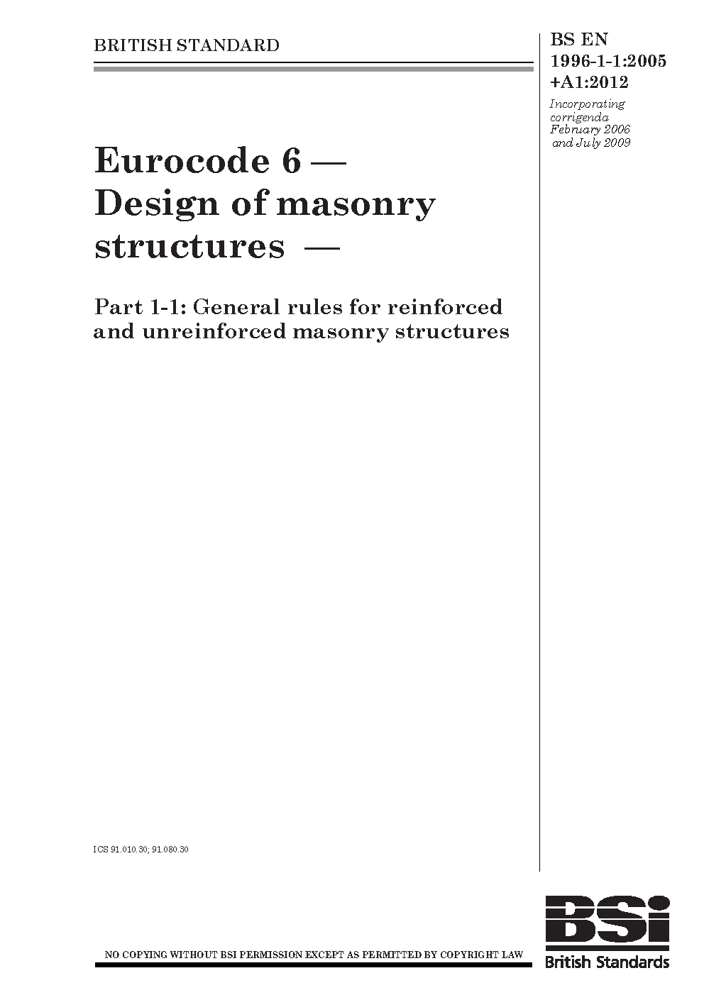 BS EN 1996-1-1. Eurocode 6. Design of masonry structures Part 1-1. General rules for reinforced and unreinforced