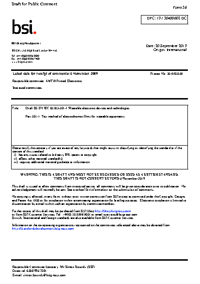BS EN IEC 63203-301-1. Wearable electronic devices and technologies Part 301-1. Test method of electrochromic films for wearable equipments