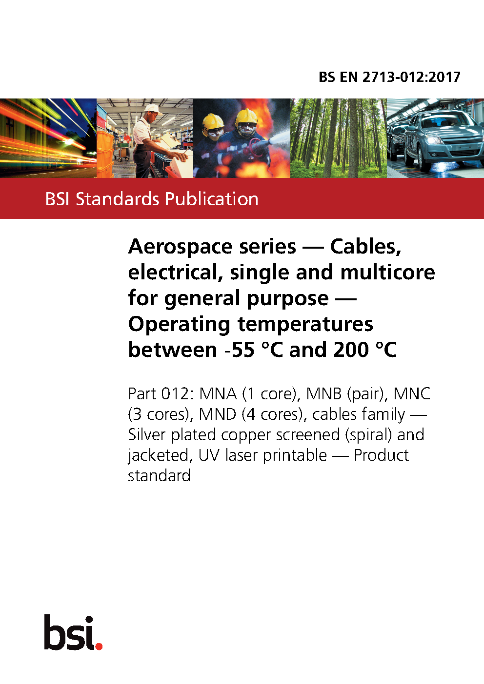 BS EN 2713-012. Aerospace series. Cables, electrical, single and multicore for general purpose. Operating temperatures between – 55 °C 200 Part 012. MNA (1 core), MNB (pair), MNC (3 cores), MND (4 cables family. Silver plated copper screened (spiral) jacketed, UV laser printable. Product standard