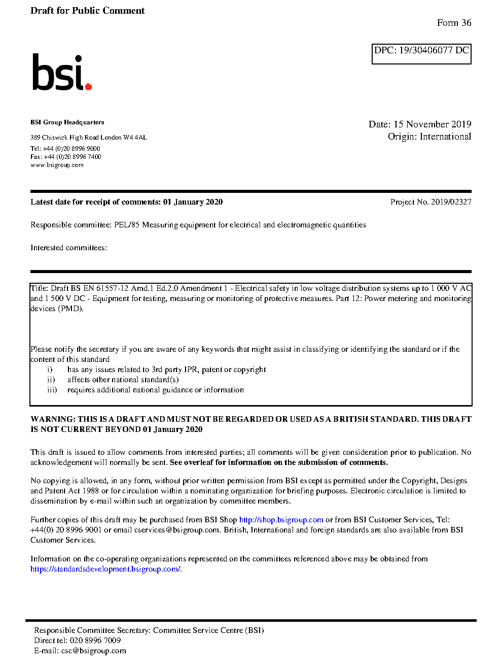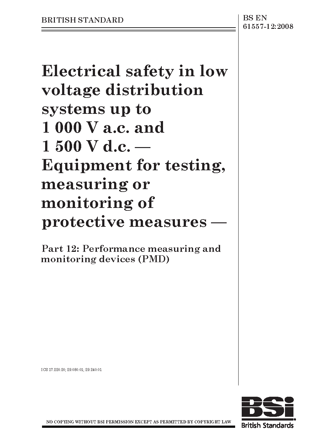 BS EN 61557-12 AMD1. Electrical safety in low voltage distribution systems up to 1 000 V AC and 500 DC. Equipment for testing, measuring or monitoring of protective measures Part 12. Power metering devices (PMD)