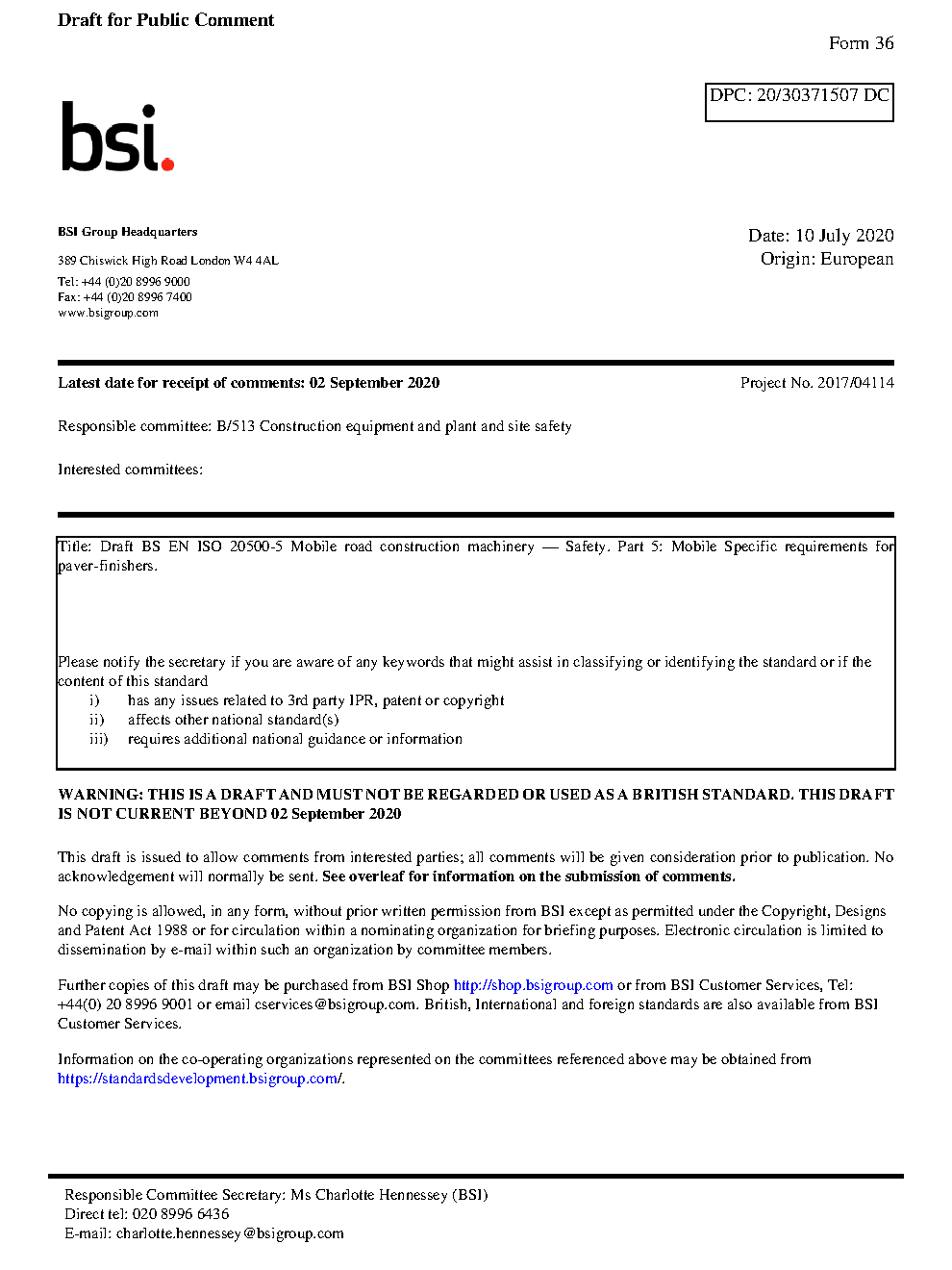 BS EN ISO 20500-5. Mobile road construction machinery. Safety Part 5. Specific requirements for paver-finishers