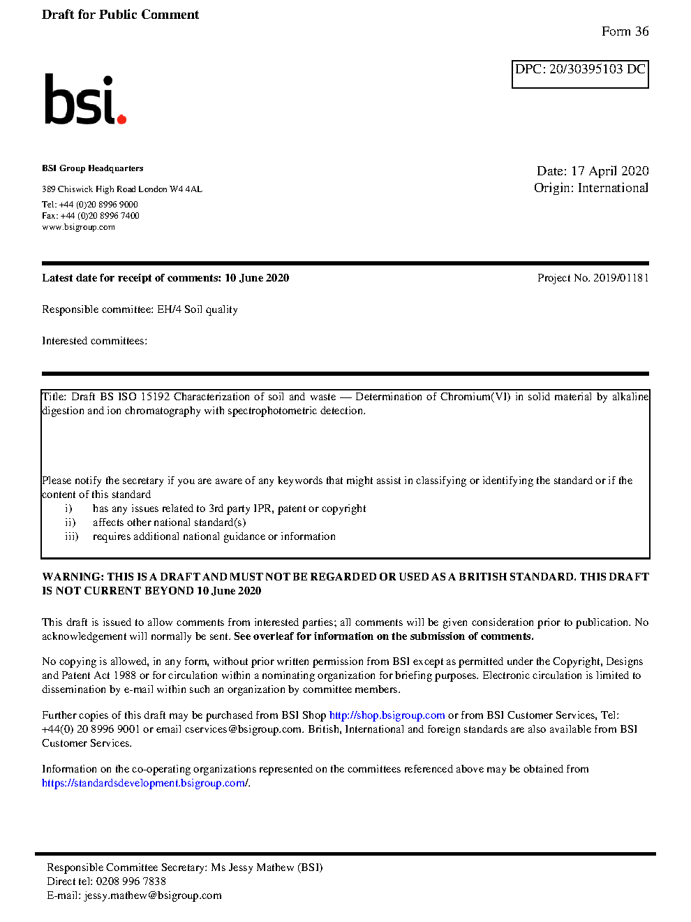 BS ISO 15192. Characterization of soil and waste. Determination of Chromium(VI) in solid material by alkaline digestion and ion chromatography with spectrophotometric detection
