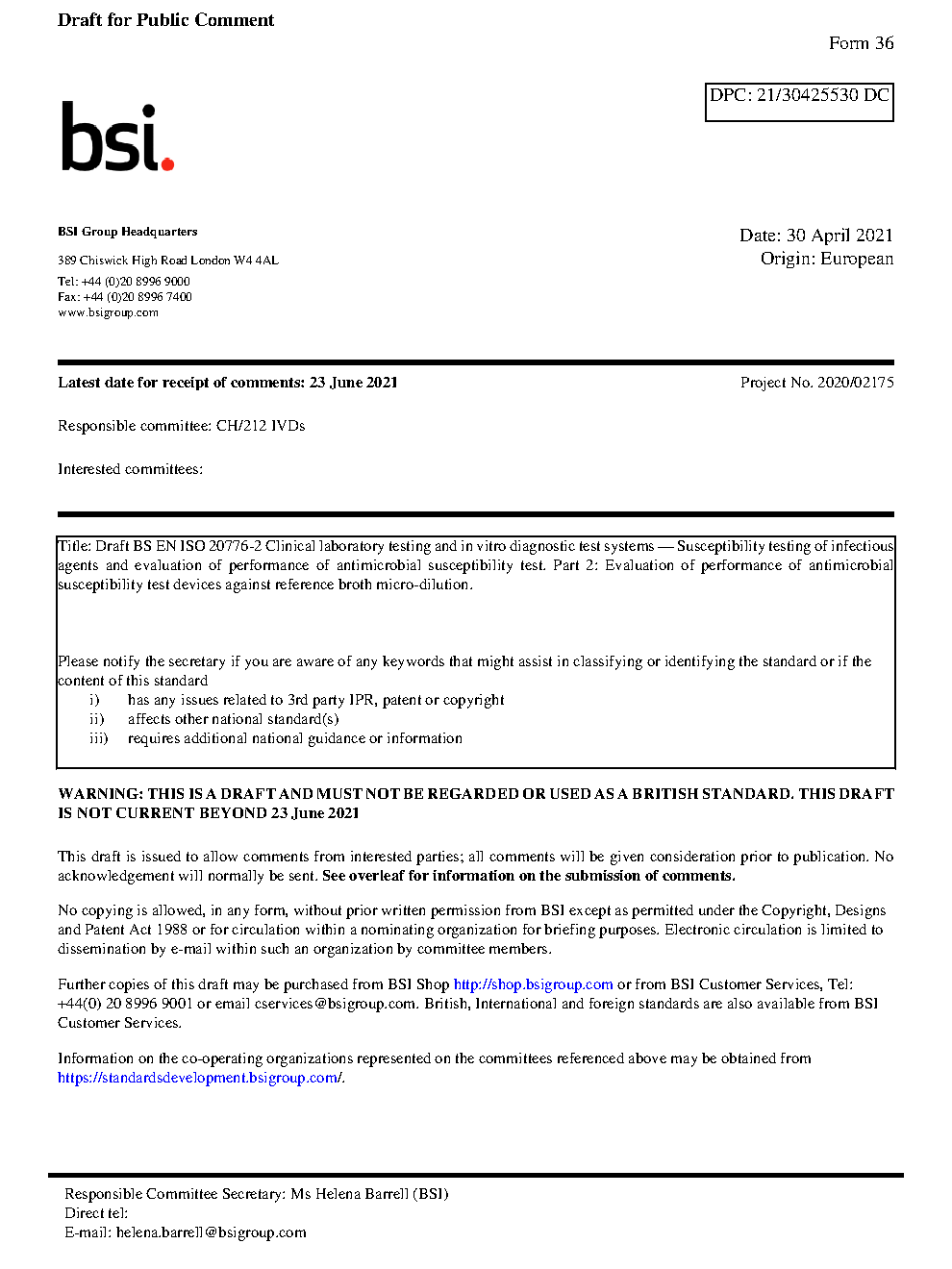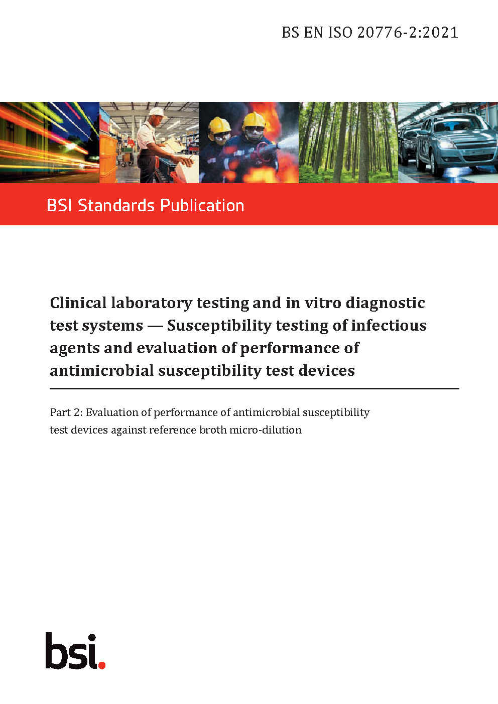BS EN ISO 20776-2. Clinical laboratory testing and in vitro diagnostic test systems. Susceptibility of infectious agents evaluation performance antimicrobial susceptibility Part 2. Evaluation devices against reference broth micro-dilution