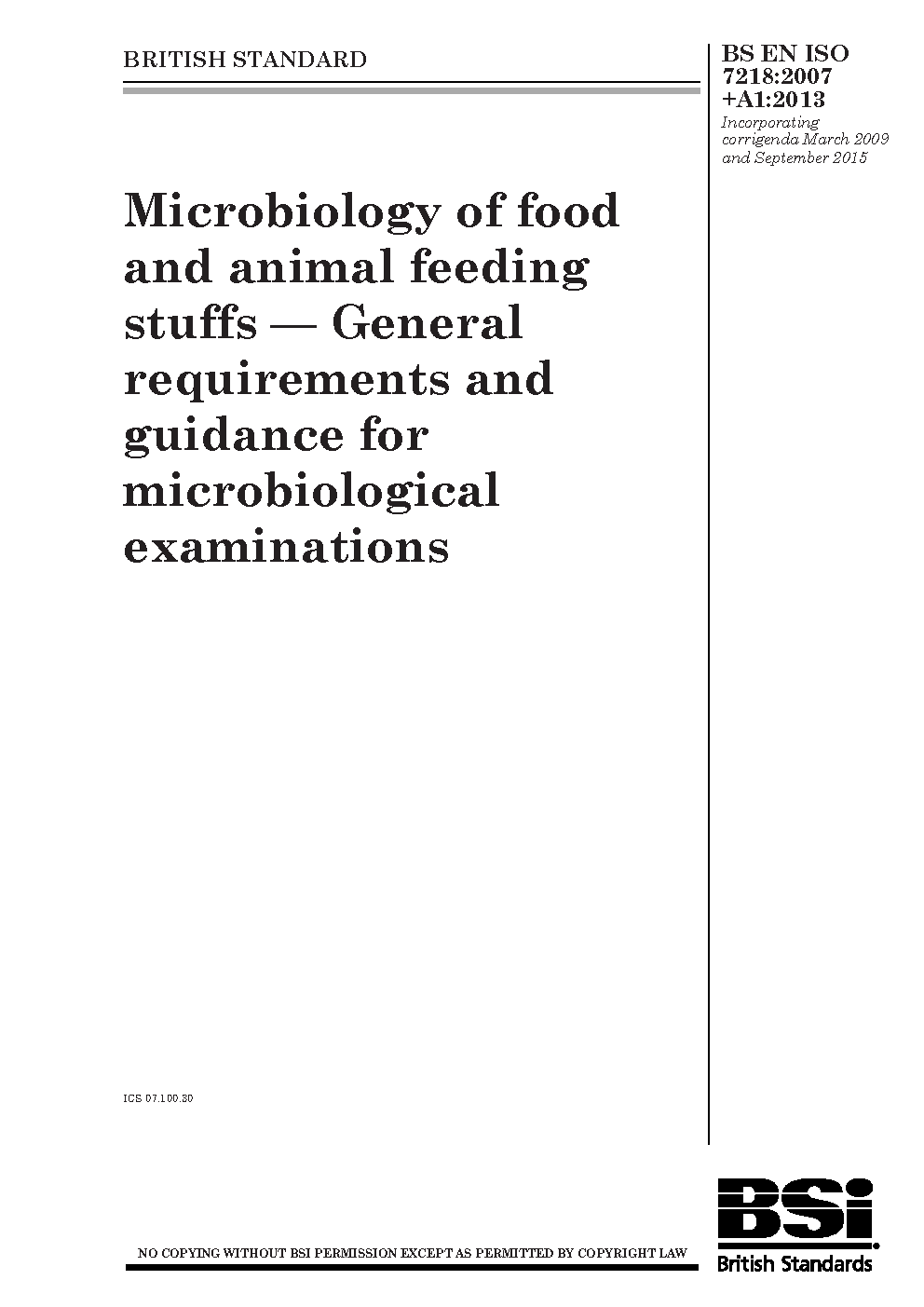 BS EN ISO 7218. Microbiology of the food chain. General requirements and guidance for microbiological examinations