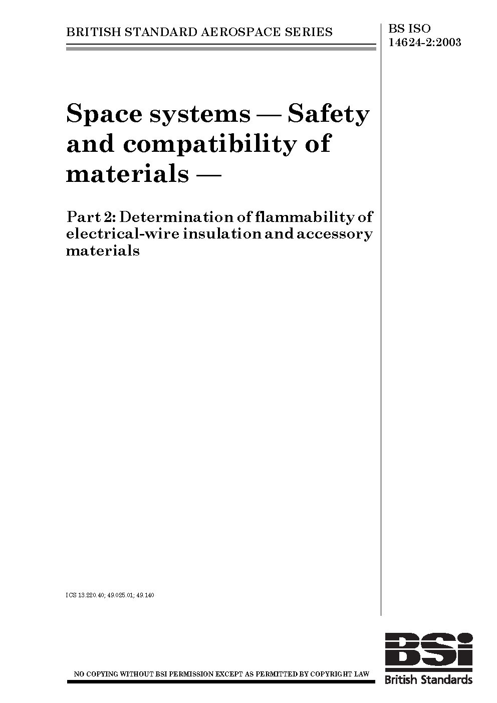 BS ISO 14624-2. Space systems. Safety and compatibility of materials Part 2. Determination flammability electrical-wire insulation accessory