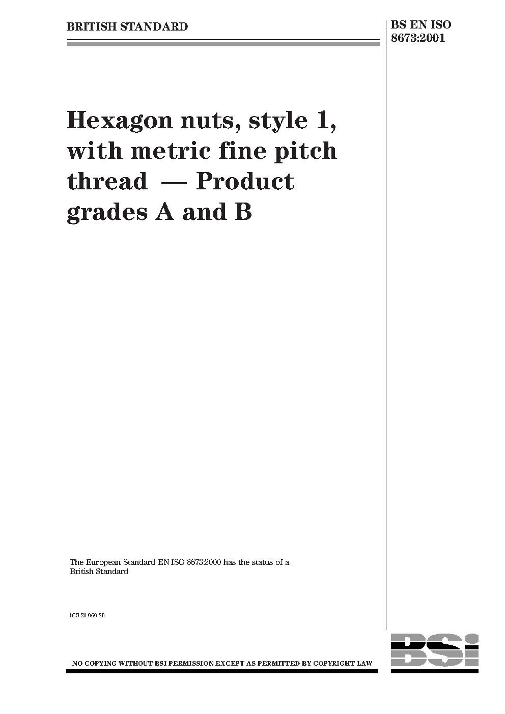 BS EN ISO 8673. Fasteners. Hexagon regular nuts (style 1), with fine pitch thread