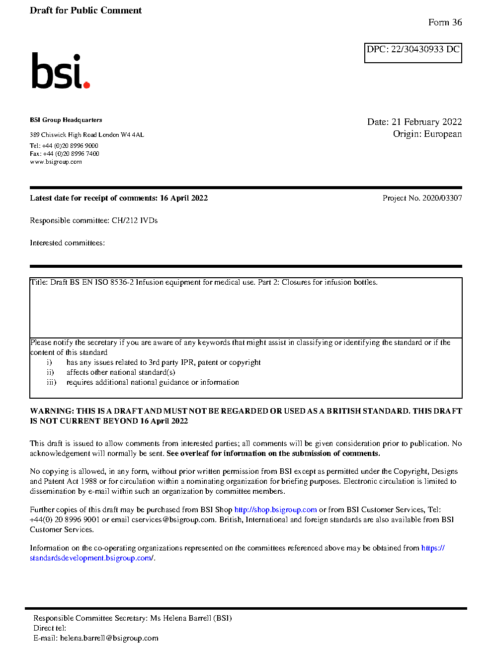 BS ISO 8536-2. Infusion equipment for medical use Part 2. Closures infusion bottles