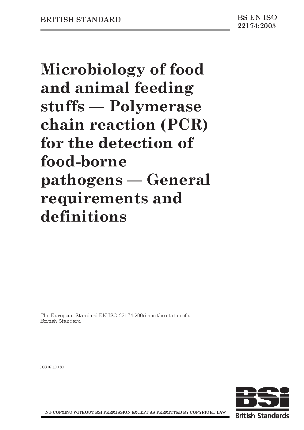 BS EN ISO 22174. Microbiology of the food chain. Polymerase chain reaction (PCR) for the detection and quantification of microorganisms. General requirements and definitions
