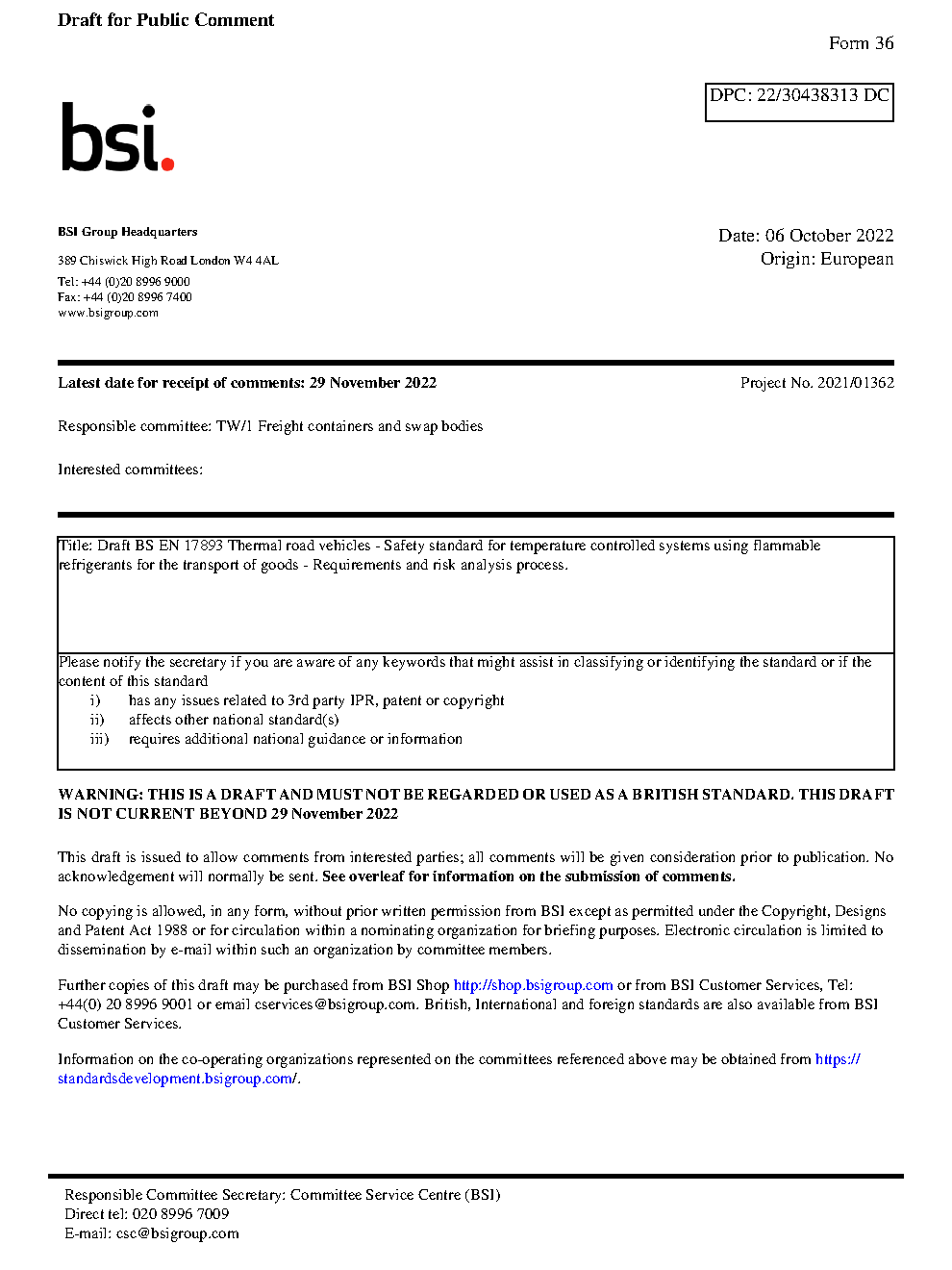 BS EN 17893. Thermal road vehicles. Safety standard for temperature controlled systems using flammable refrigerants for the transport of goods. Requirements and risk analysis process