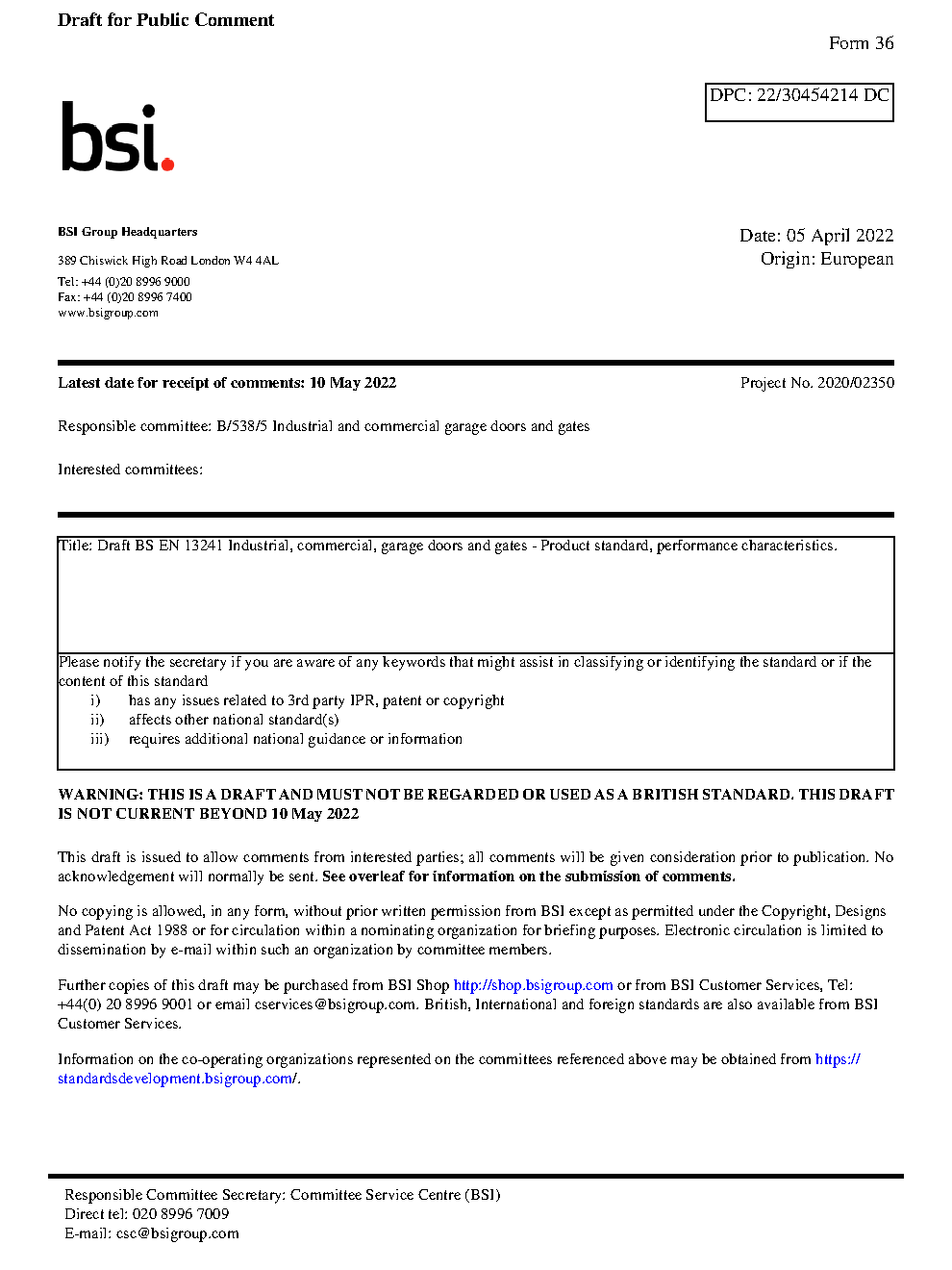 BS EN 13241. Industrial, commercial, garage doors and gates. Product standard, performance characteristics