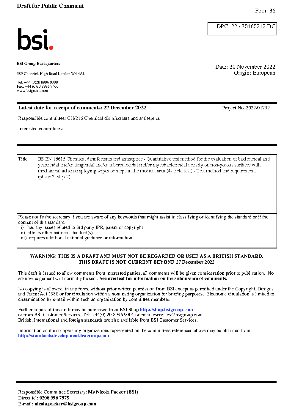 BS EN 16615. Chemical disinfectants and antiseptics. Quantitative test method for the evaluation of bactericidal and yeasticidal and/or fungicidal and/or tuberculocidal and/or mycobactericidal activity on non-porous surfaces with mechanical action employing wipes or mops in the medical area (4- field test) - Test method and requirements (phase 2, step 2)