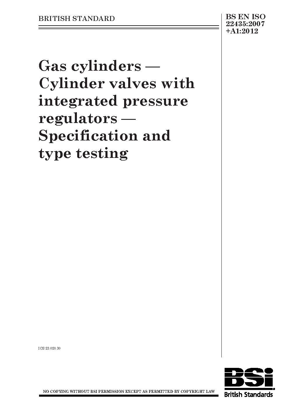 BS EN ISO 22435. Gas cylinders. Cylinder valves with integrated pressure regulators. Specification and type testing