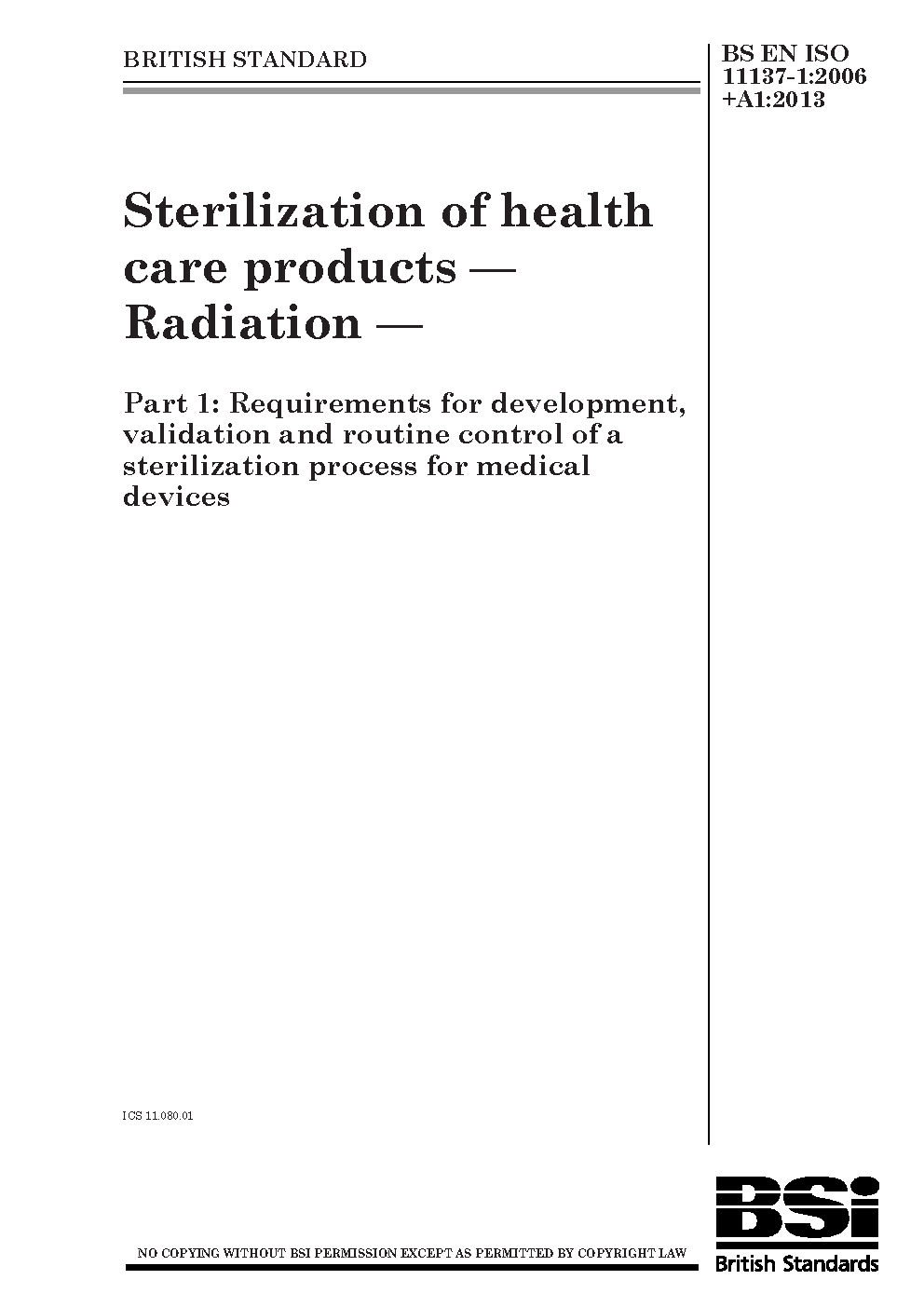 BS EN ISO 11137-1. Sterilization of health care products. Radiation Part 1. Requirements for development, validation and routine control a sterilization process medical devices