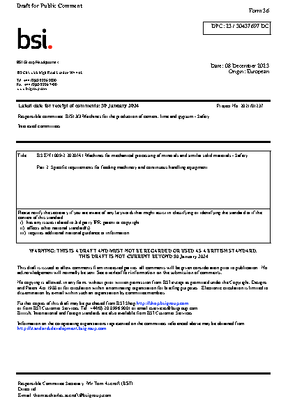BS EN 1009-2:2020/A1 Machines for mechanical processing of minerals and similar solid materials - Safety Part 2: Specific requirements feeding machinery continuous handling equipment