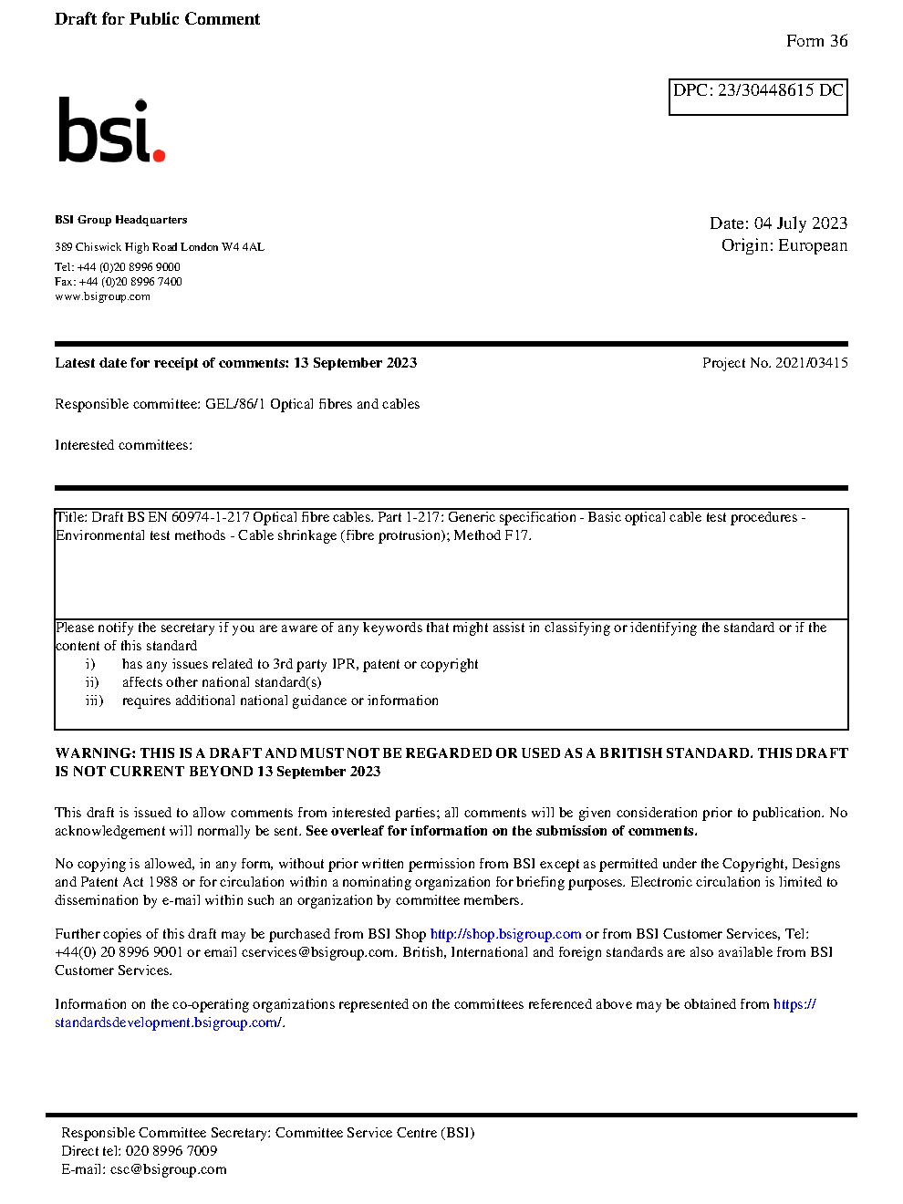 BS EN IEC 60794-1-217. Optical fibre cables Part 1-217. Generic specification. Basic optical cable test procedures. Environmental methods. Cable shrinkage (fibre protrusion); Method F17