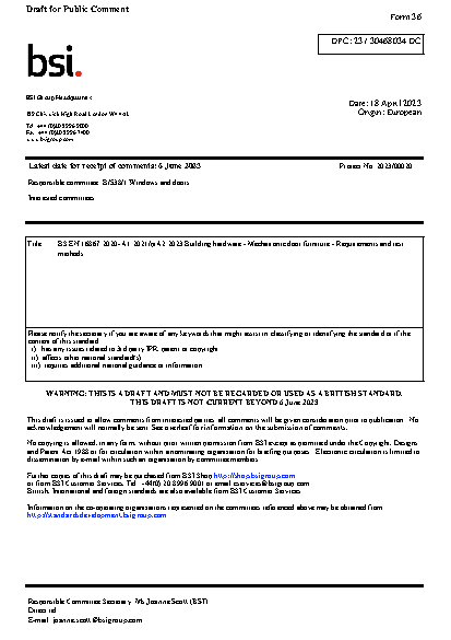 BS EN 16867 AMD 2. Building hardware. Mechatronic door furniture. Requirements and test methods