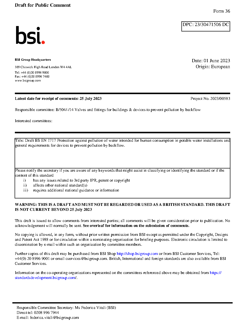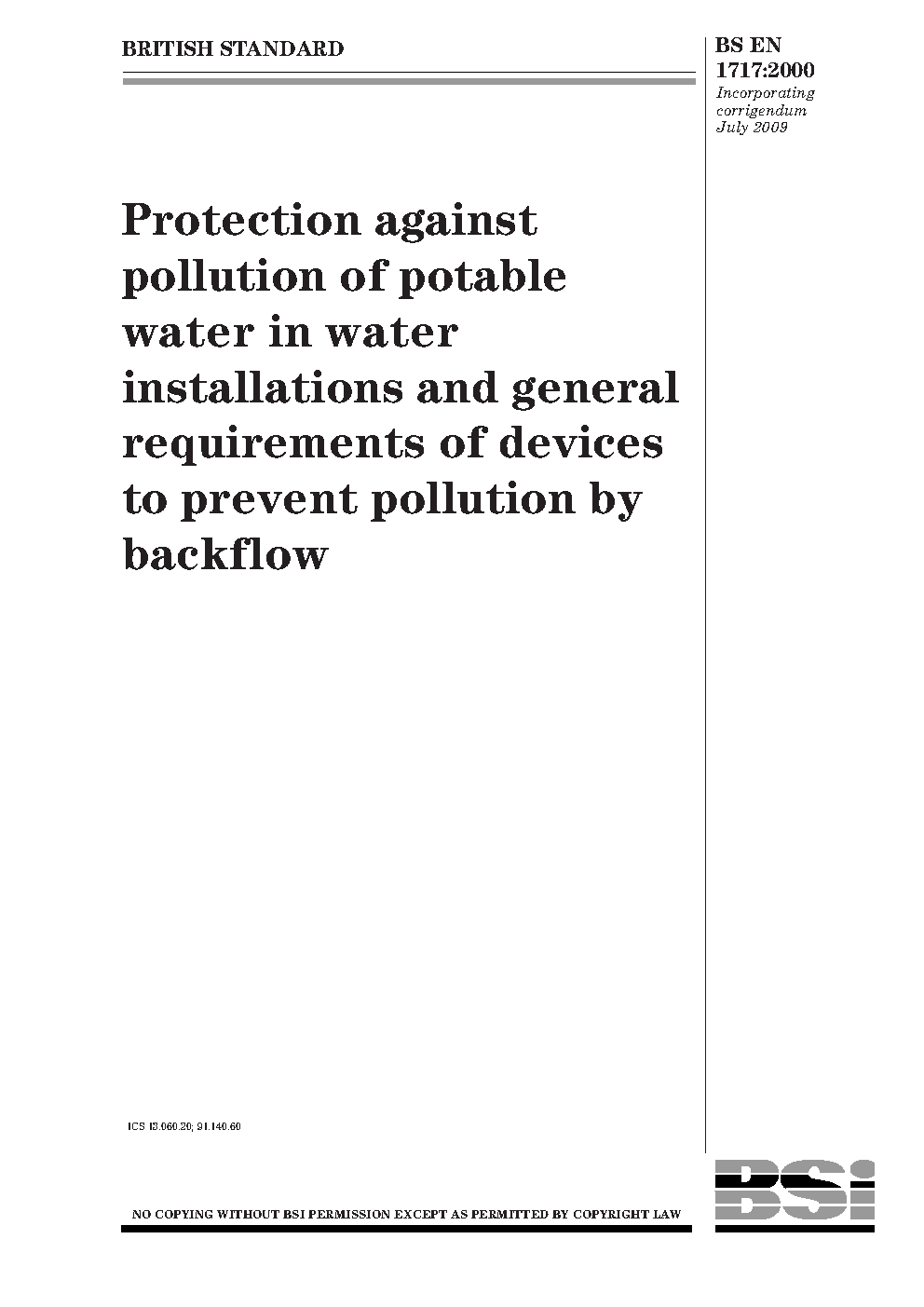 BS EN 1717. Protection against pollution of water intended for human consumption in potable water installations and general requirements for devices to prevent pollution by backflow
