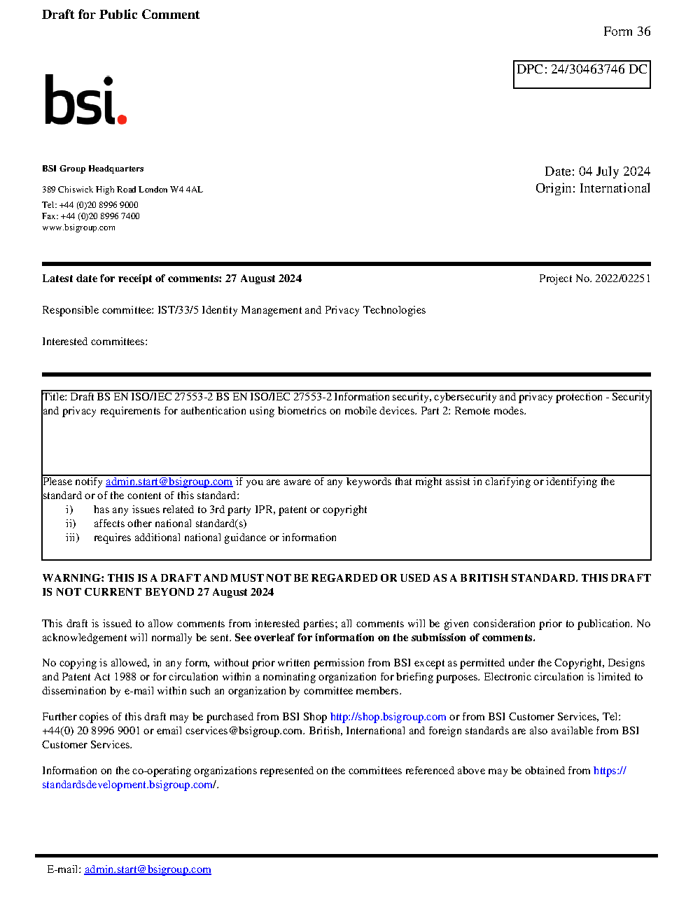 BS EN ISO/IEC 27553-2 Information security, cybersecurity and privacy protection - Security requirements for authentication using biometrics on mobile devices Part 2: Remote modes