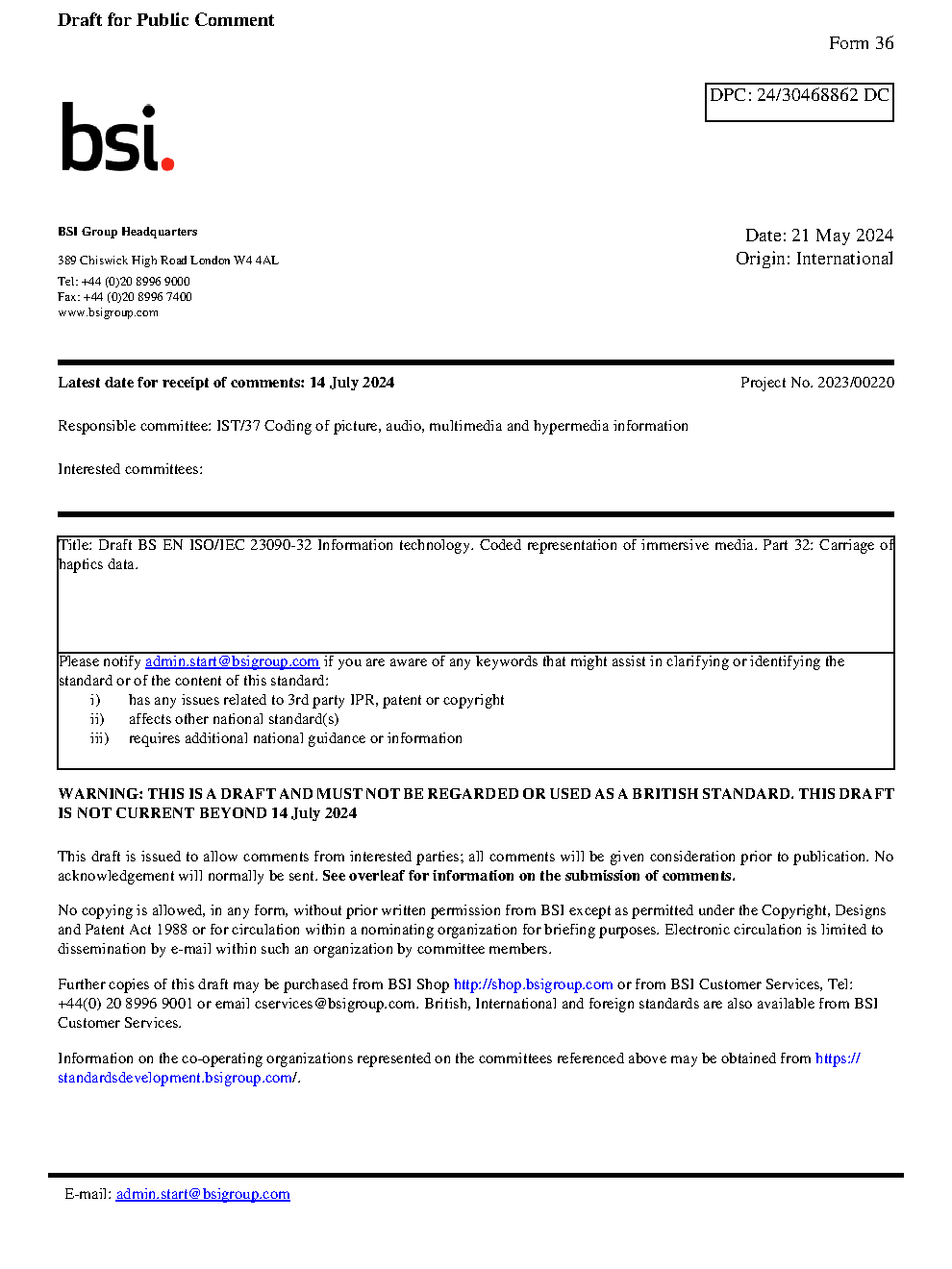 BS ISO/IEC 23090-32 Information technology - Coded representation of immersive media Part 32: Carriage haptics data