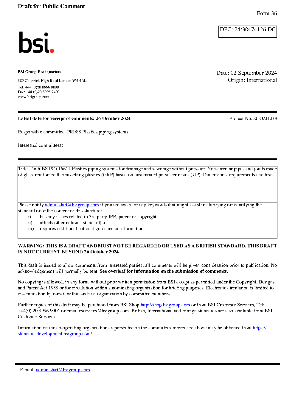 BS ISO 16611 Plastics piping systems for drainage and sewerage without pressure. Non-circular pipes and joints made of glass-reinforced thermosetting plastics (GRP) based on unsaturated polyester resins (UP). Dimensions, requirements and tests