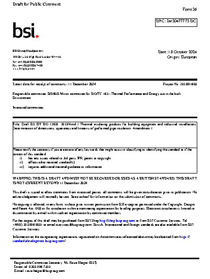 BS EN ISO 12628:2022/Amd 1 Thermal insulating products for building equipment and industrial installations. Determination of dimensions, squareness and linearity of preformed pipe insulation. Amendment 1