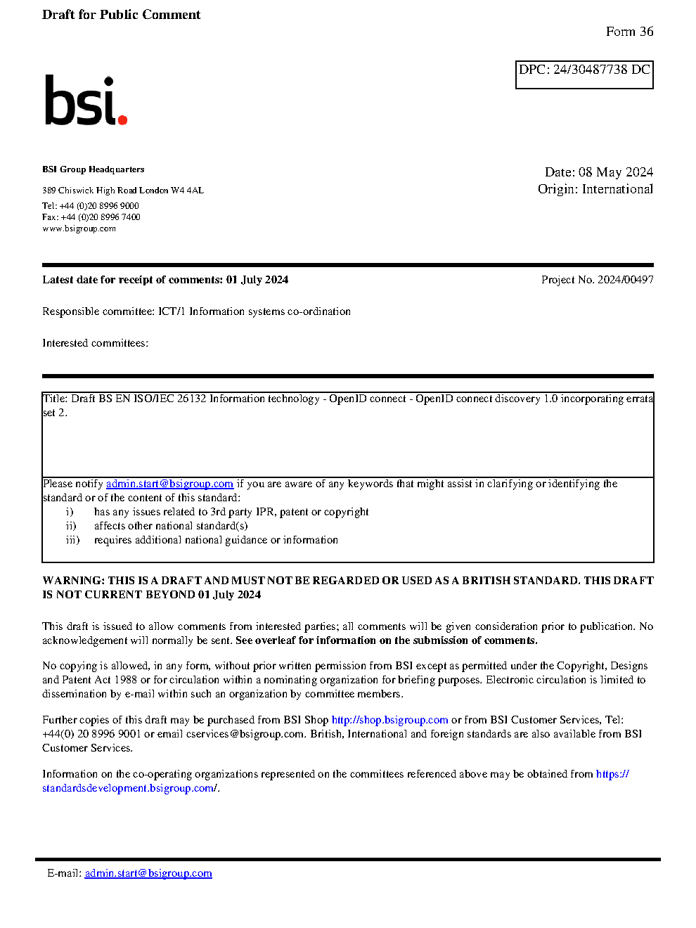 Draft BS EN ISO/IEC 26132 Information technology. OpenID connect. OpenID connect discovery 1.0 incorporating errata set 2