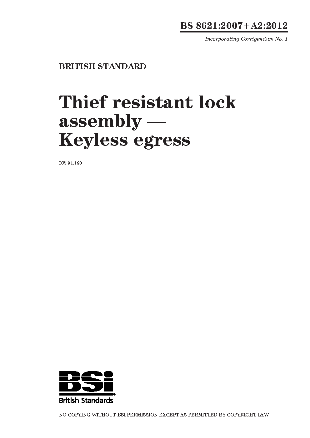 BS 8621:2017+A1. Lock assemblies operated by key from outside of the door and by handle or thumb turn from the inside of the door