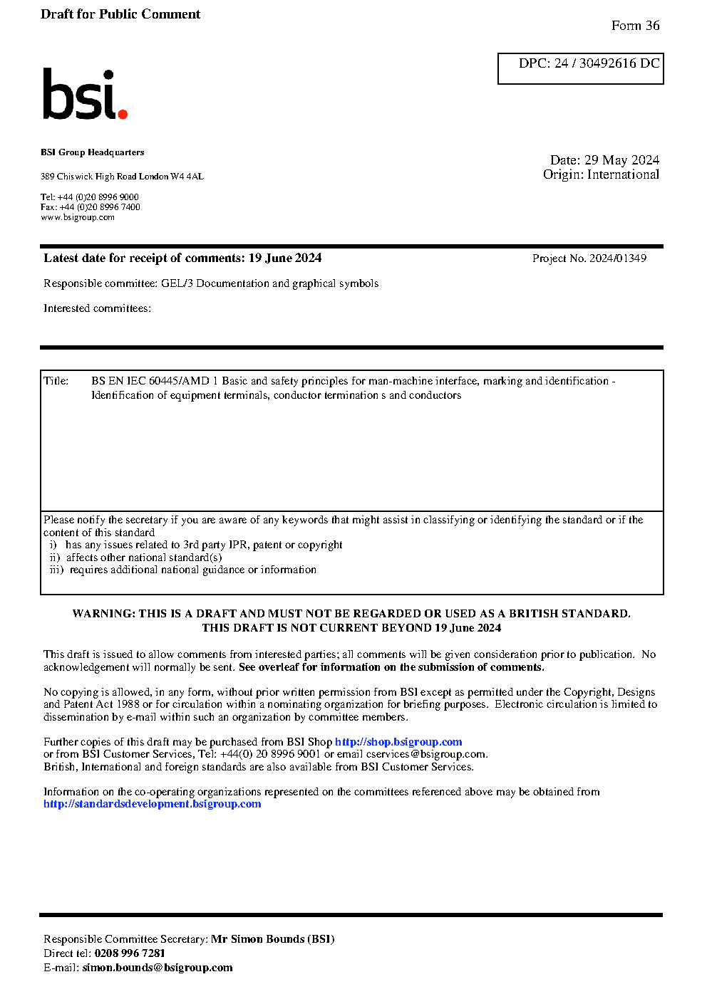 BS EN IEC 60445/AMD 1 Basic and safety principles for man-machine interface, marking and identification - Identification of equipment terminals, conductor termination s and conductors