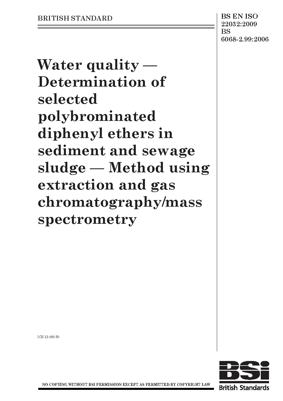 BS EN ISO 22032. Water quality. Determination of polybrominated diphenyl ethers (PBDE) in sediment, suspended (particulate) matter and biota. Method using gas chromatography-tandem mass spectrometry or high resolution mass spectrometry (GC- MS/MS; HRMS)