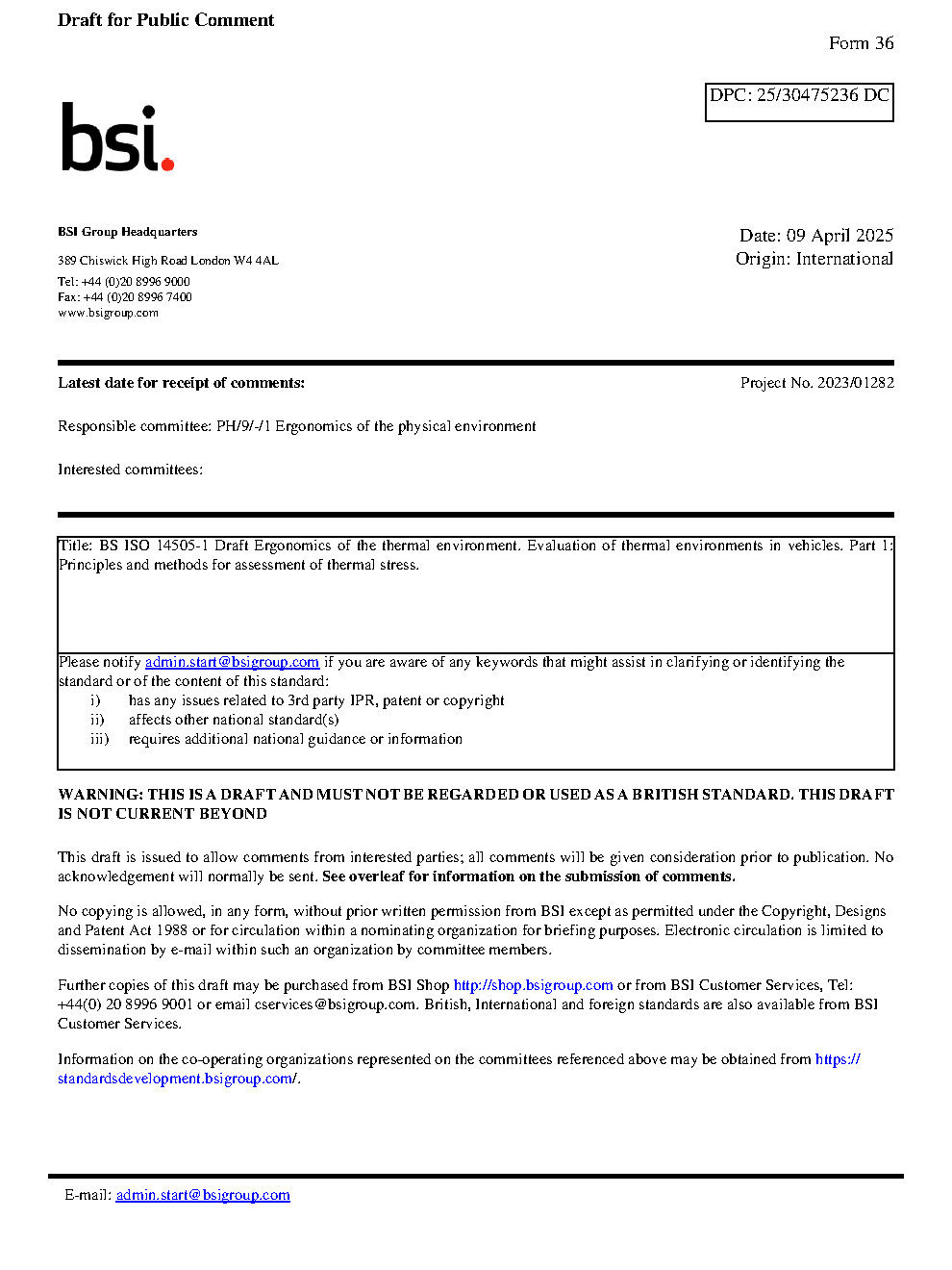Draft BS ISO 14505-1. Ergonomics of the thermal environment. Evaluation environments in vehicles Part 1. Principles and methods for assessment stress