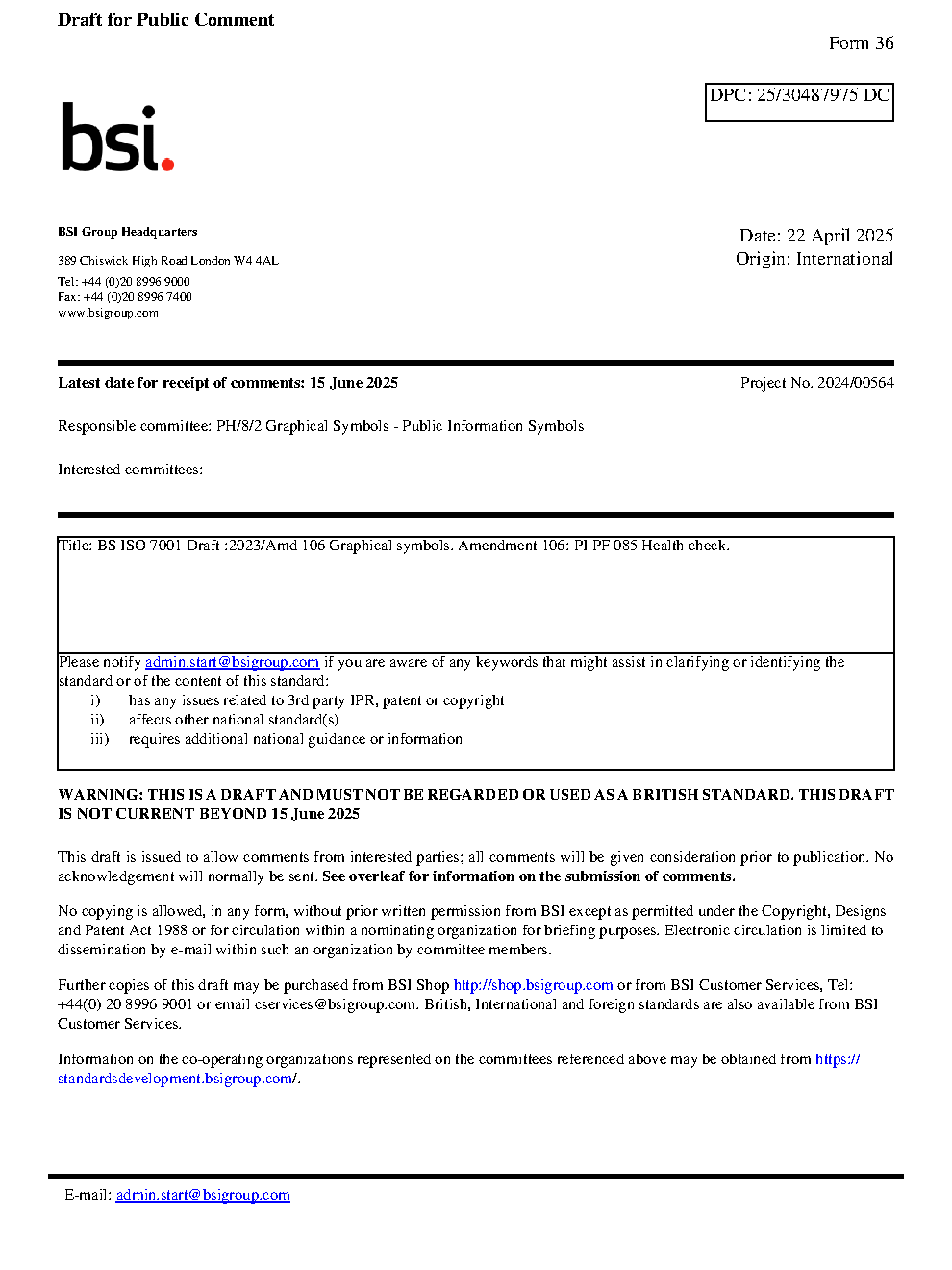 Draft BS ISO 7001:2023/Amd 106 Graphical symbols. Amendment 106: PI PF 085 Health check
