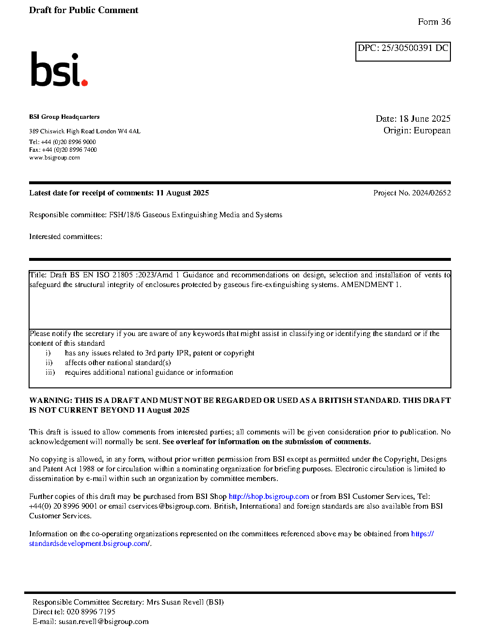 BS EN ISO 21805:2023/Amd 1 Guidance and recommendations on design, selection and installation of vents to safeguard the structural integrity of enclosures protected by gaseous fire-extinguishing systems. AMENDMENT 1