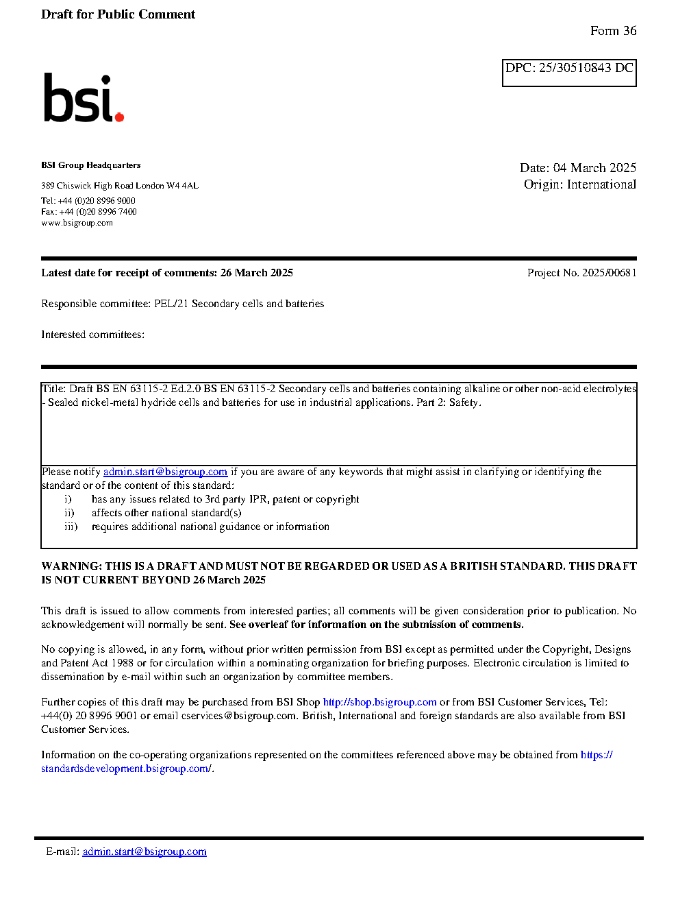 Draft BS EN 63115-2 Secondary cells and batteries containing alkaline or other non-acid electrolytes. Sealed nickel-metal hydride for use in industrial applications Part 2. Safety