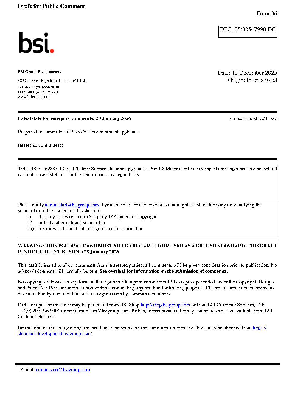 Draft BS EN 62885-13 Ed.1.0 Surface cleaning appliances Part 13: Material efficiency aspects for household or similar use - Methods the determination of reparability