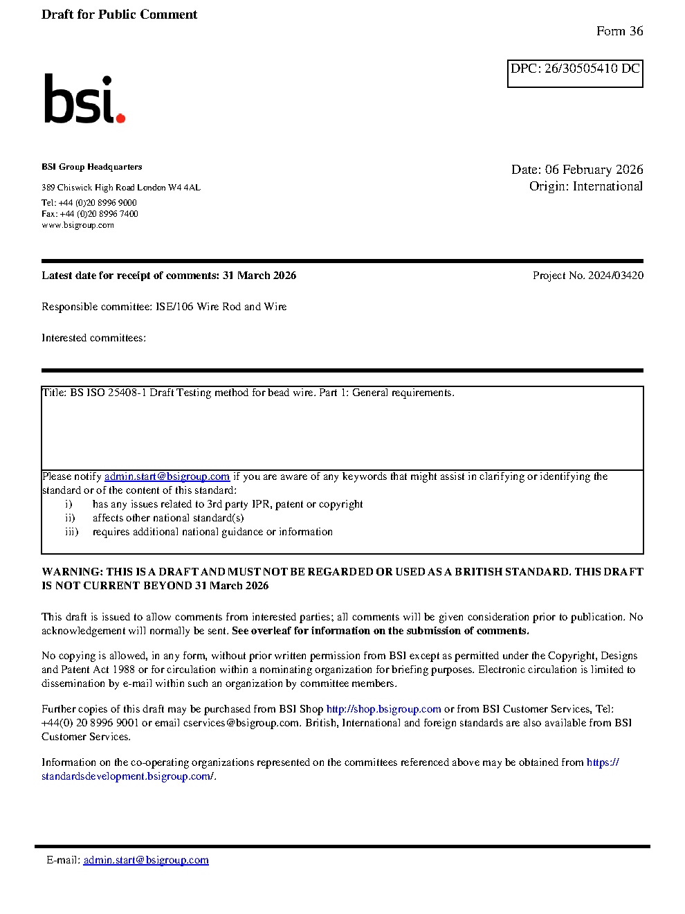 Draft BS ISO 25408-1 Testing method for bead wire. Part 1: General requirements