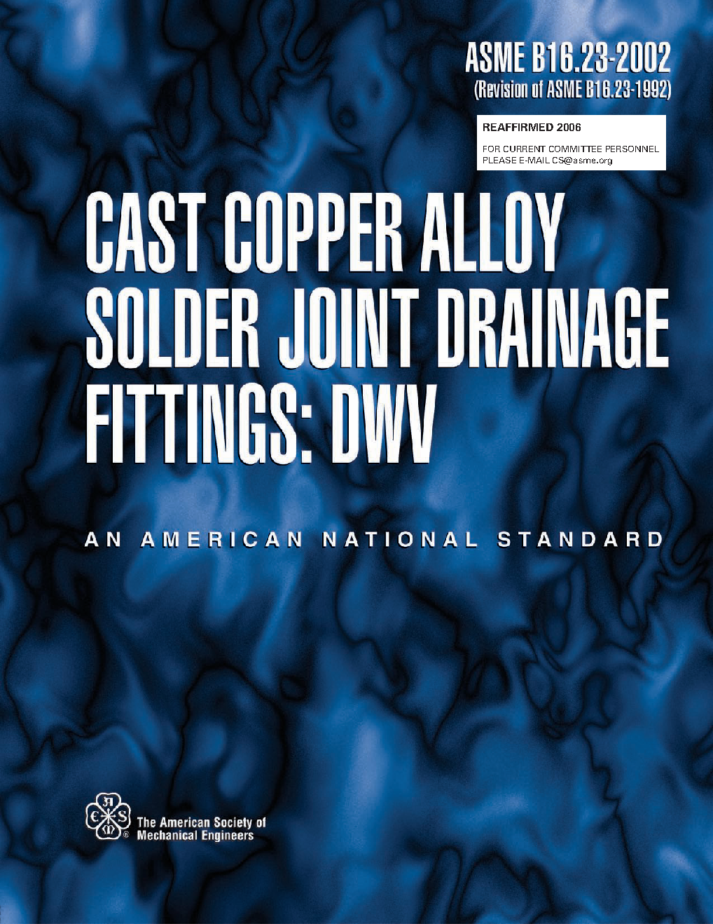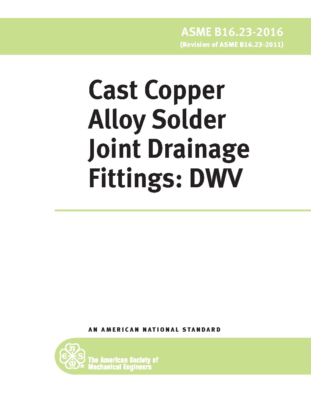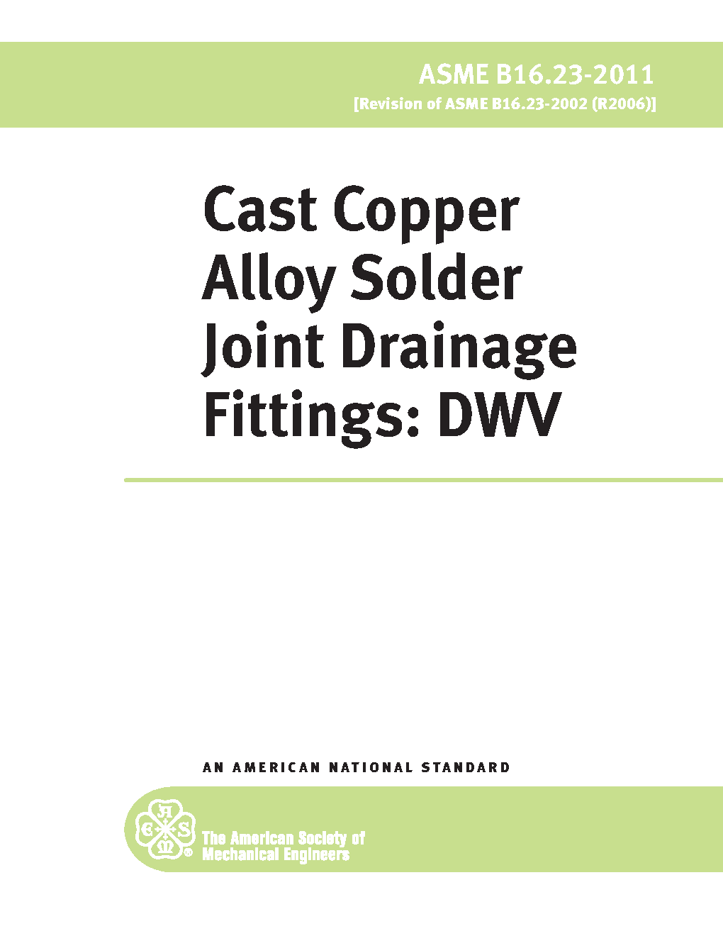 This Standard establishes specifications for cast copper alloy solder joint drainage fittings, designed for use in drains, waste, and vent (DWV) systems. These fittings are designed for use with seamless copper tube conforming to ASTM B 306, Copper Drainage Tube (DWV), as well as fittings intended to be assembled with soldering materials conforming to ASME B1.20.1.