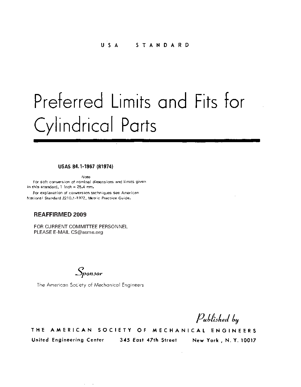 This Standard presents definitions of terms applying to fits between plain (non-threaded) cylindrical parts and makes recommendations on preferred sizes, allowances, tolerances and fits for diameters up to 20 inches.