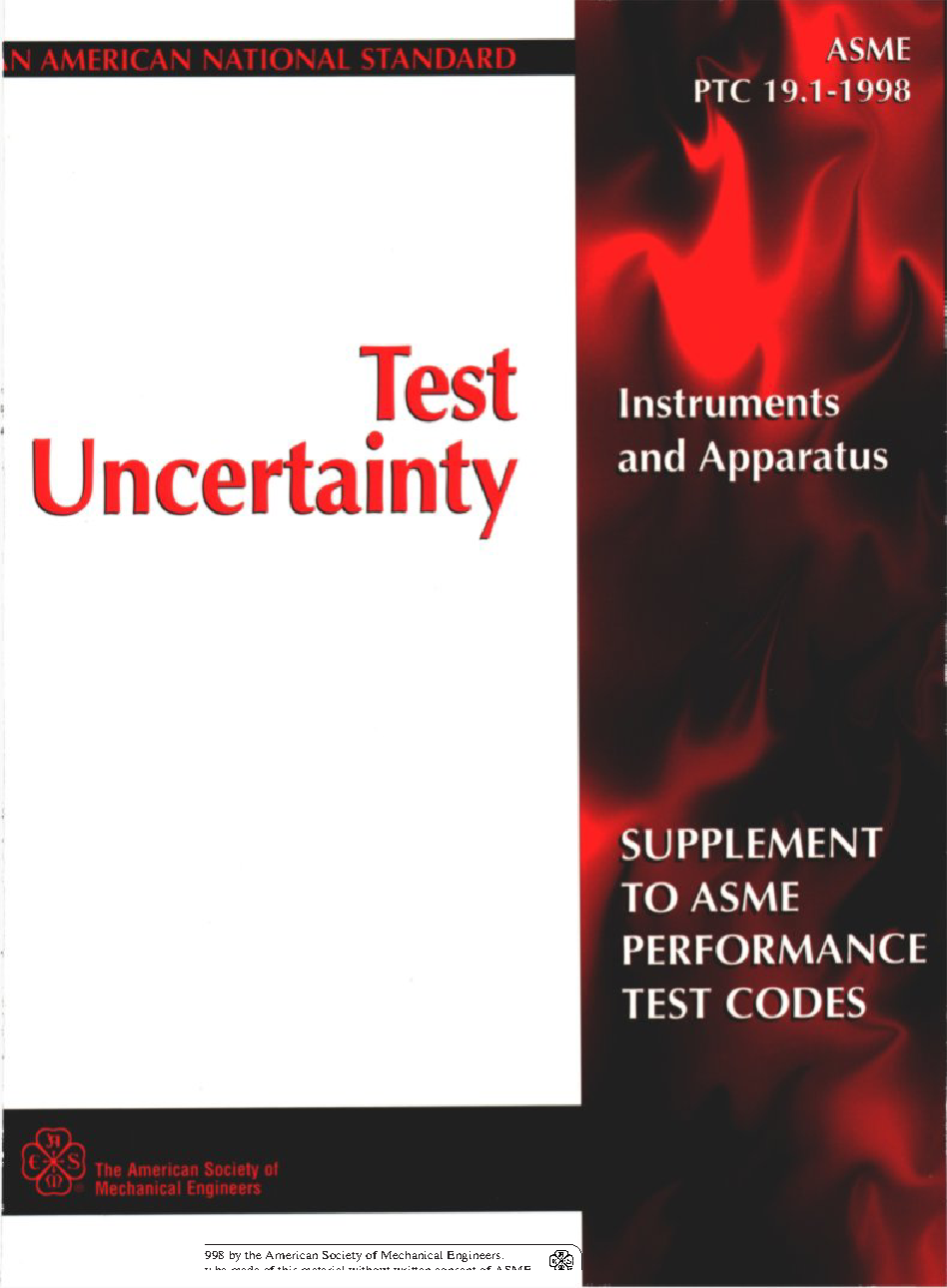 This Standard specifies procedures for evaluation of uncertainties in test measurements, parameters and methods, and for propagation of those uncertainties into the uncertainty of a test result. Depending on the application, uncertainty sources may be classified either by the presumed effect (systematic or random) on the measurement or test result, or by the process in which they may be quantified (Type A or Type B). The end result of an uncertainty analysis is a numerical estimate of the test uncertainty with an appropriate confidence level.