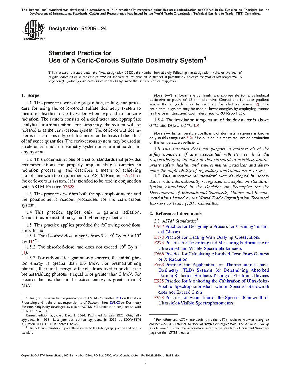 1.1 This practice covers the preparation, testing, and procedure for using the ceric-cerous sulfate dosimetry system to measure absorbed dose to water when exposed to ionizing radiation. The system consists of a dosimeter and appropriate analytical instrumentation. For simplicity, the system will be referred to as the ceric-cerous system. The ceric-cerous dosimeter is classified as a type 1 dosimeter on the basis of the effect of influence quantities. The ceric-cerous system may be used as a reference standard dosimetry system or as a routine dosimetry system.