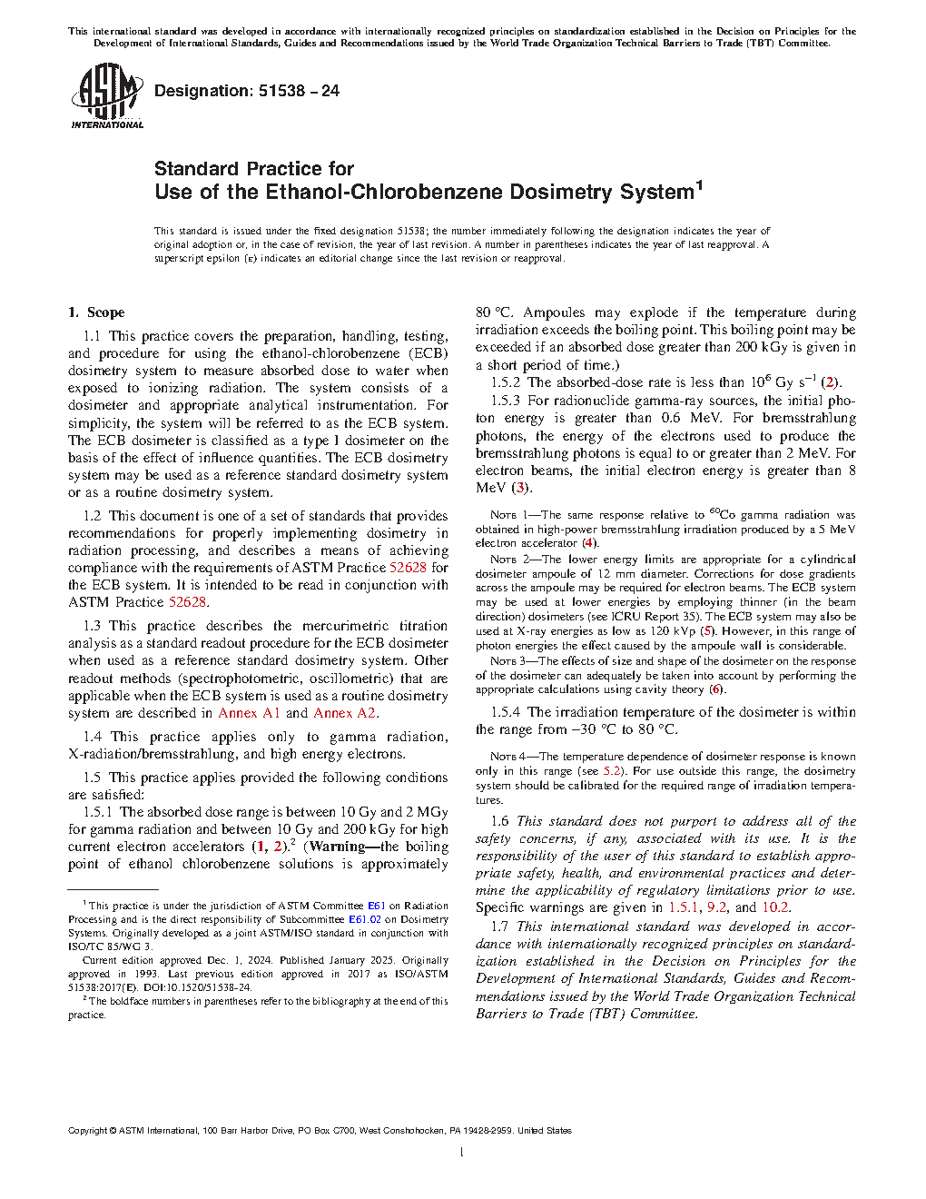 1.3 This practice describes the mercurimetric titration analysis as a standard readout procedure for the ECB dosimeter when used as a reference standard dosimetry system. Other readout methods (spectrophotometric, oscillometric) that are applicable when the ECB system is used as a routine dosimetry system are described in Annex A1 and Annex A2.