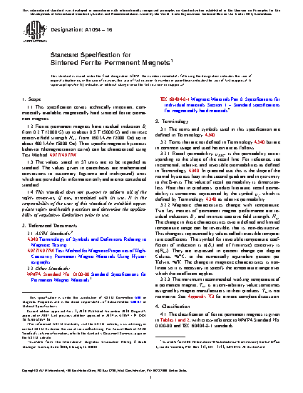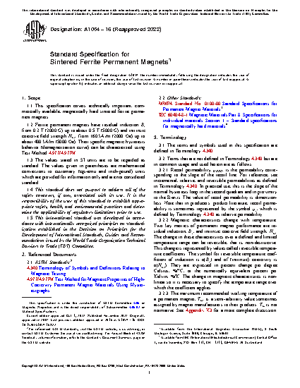 This specification covers technically important, commercially available, magnetically hard sintered ceramic ferrite permanent magnets. Both barium and strontium ferrite materials are covered by this specification. Both isotropic (1 type) and anisotropic (12 types) are covered. A cross reference to both IEC and MMPA designations is provided. The magnetic property requirements for each type are defined as is the method of test. Other defined requirements include the workmanship. Typical physical properties are listed in the appendices.