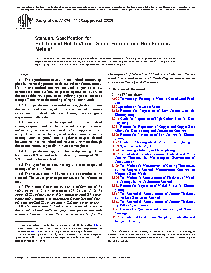 1.1 This specification covers tin and tin/lead coatings applied by the hot dip process on ferrous and non-ferrous metals. hot tin and tin/lead coatings are used to provide a low contact-resistance surface, to protect against corrosion, to facilitate soldering, to provide anti-galling properties, and to be a stop-off coating in the nitriding of high-strength steels.