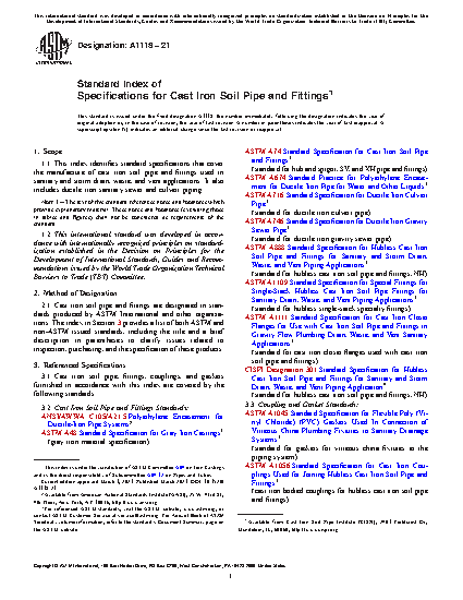 1.1 This index identifies standard specifications that cover the manufacture of cast iron soil pipe and fittings used in sanitary and storm drain, waste, and vent applications. It also includes ductile iron sanitary sewer and culvert piping.