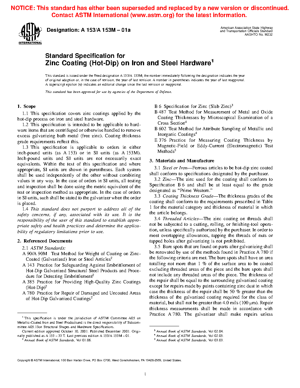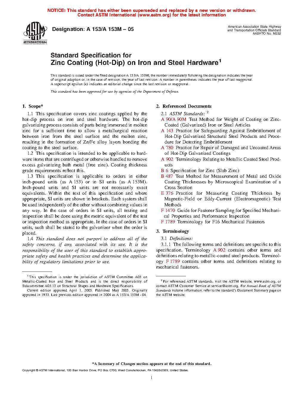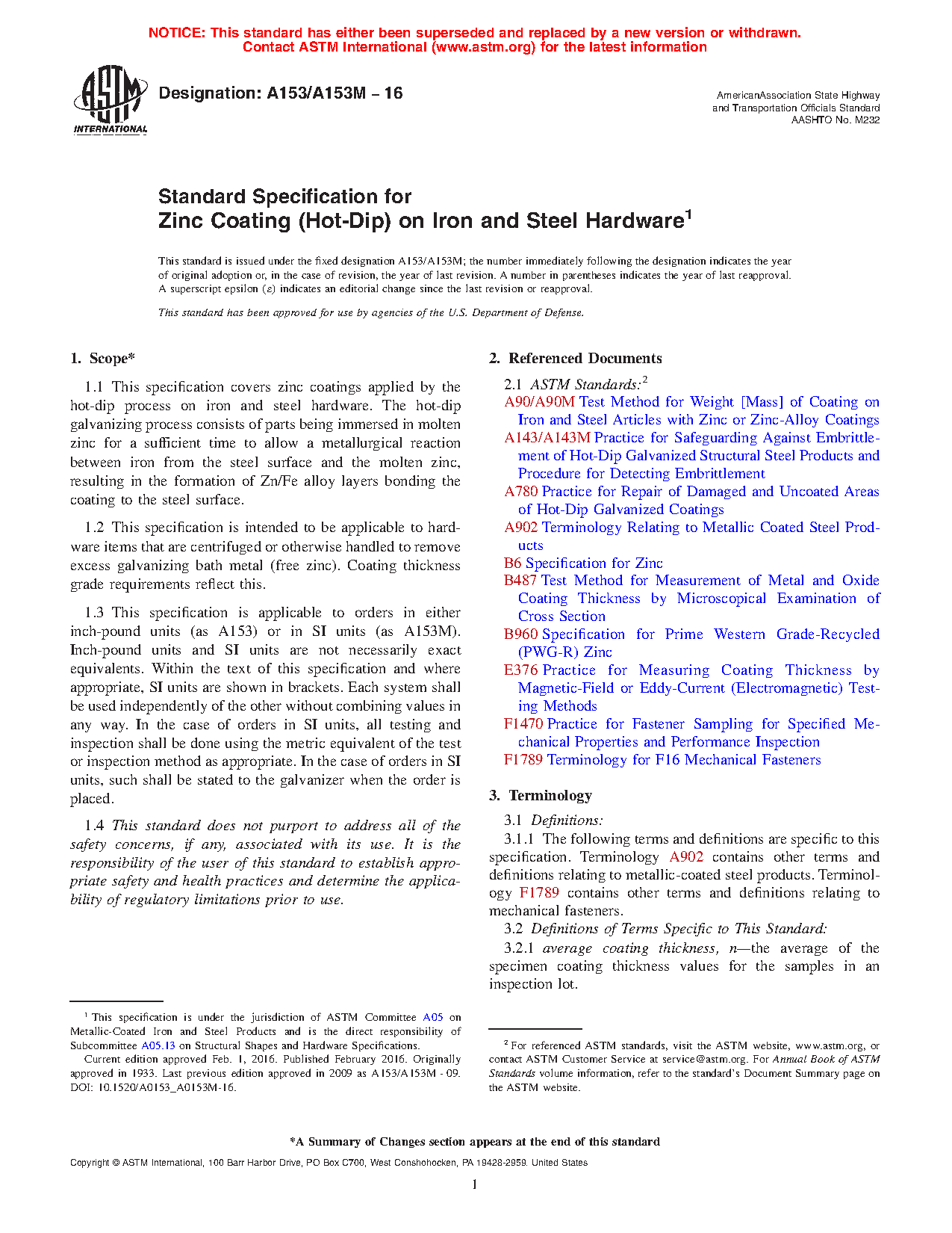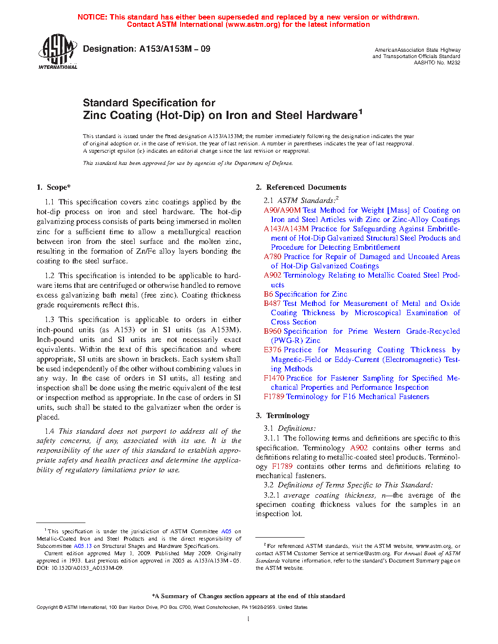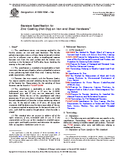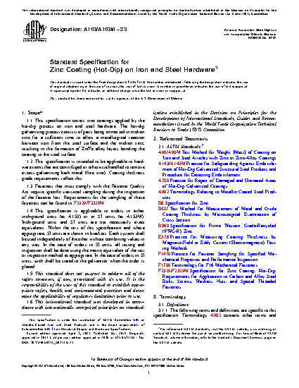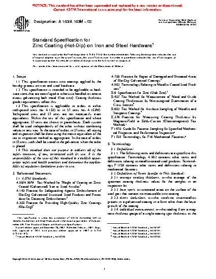1.1 This specification covers zinc coatings applied by the hot-dip process on iron and steel hardware.